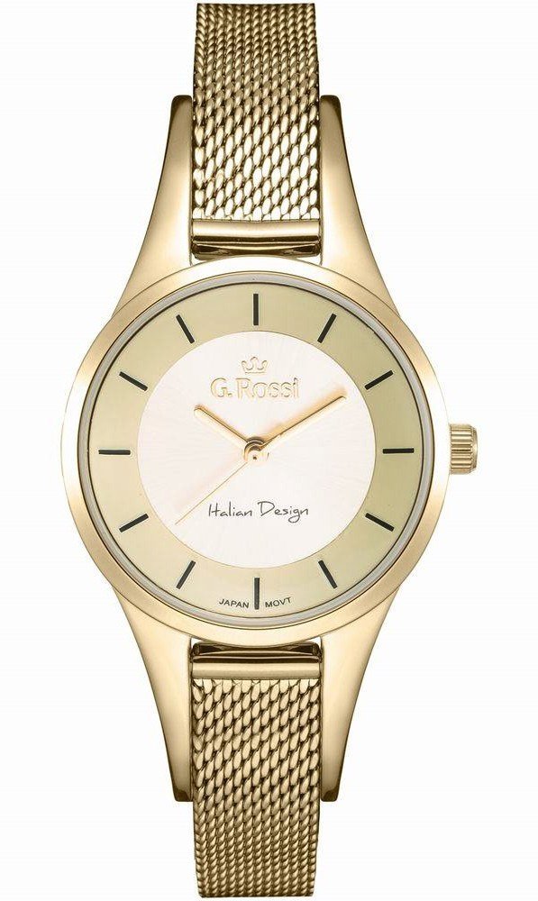Женские часы G.Rossi 8154B-4D1<br /><br /> • Дело: 29<br /><br /> • Наберите: 26<br /><br /> • Толщина: 9,9<br /><br /> • Браслет: 10<br /><br /> • Окружность запястья: макс. 205 Цветовая гамма:<br /><br /> • Корпус: золото<br /><br /> • Циферблат: золотой.<br /><br /> • часовые метки: черные<br /><br /> • Стрелки: золото<br /><br /> • Браслет: золото.