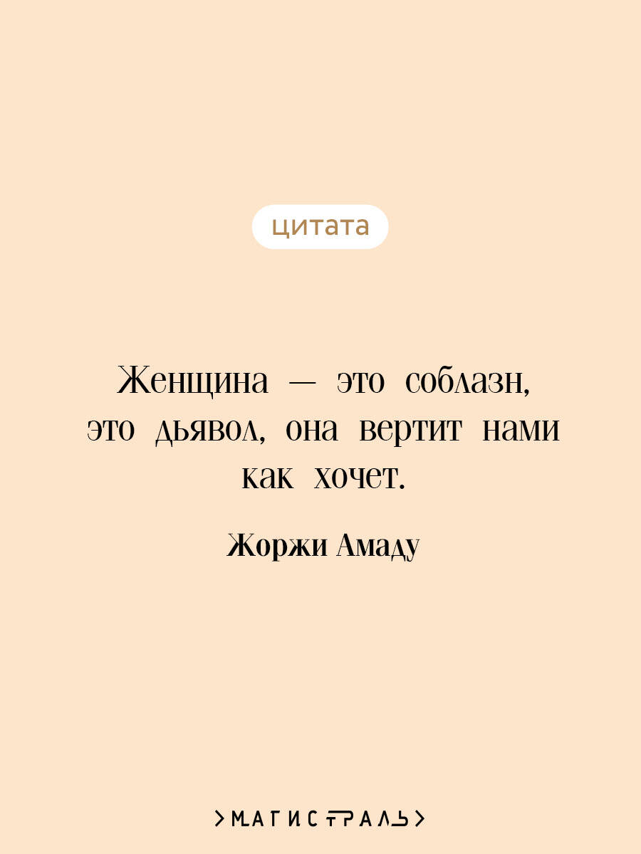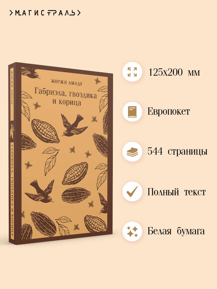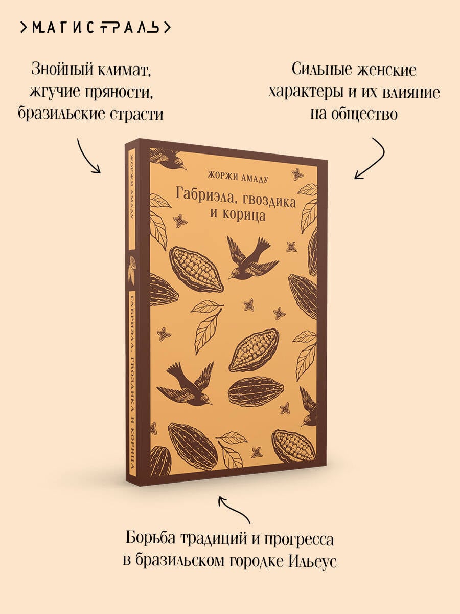 Жоржи Амаду называют бразильским Бальзаком и бразильским Гоголем. Он входит в сотню лучших авторов XX века. Роман «Габриэла, гвоздика и корица» вышел в 1958 году и произвел эффект взорвавшейся бомбы. Книга получила 12 литературных премий и вызвала жесточайшие споры - восторг одних и полное неприятие других. В городке Ильеусе царят патриархальные устои. Здесь власть принадлежит полковникам, а женщины должны быть «примерными женами». Появление Габриэлы - простой и свободолюбивой девушки - бросает вызов старым порядкам. Своей искренностью и жизнелюбием она очаровывает Насиба, владельца бара. Между ними разгорается пламя любви. Подобный мезальянс шокирует местное общество. Решится ли Насиб пойти наперекор всем и сможет ли он принять свободолюбие Габриэлы? Это роман о том, как чувства двух людей изменили Ильеус, разорвав цепи предрассудков и вдохнув в жителей городка дух свободы. Книга «Габриэла, гвоздика и корица» понравится вам, если вы остались под большим впечатлением от романов: «Сто лет одиночества» и «Любовь во время чумы» Габриэля Гарсиа Маркеса, «Дом духов» Исабель Альенде, «Город и псы» Марио Варгаса Льосы и «Шоколад» Джоанн Харрис. Книга издается в мягкой обложке с клапанами, которые можно использовать как закладки. Вы никогда не потеряете место, на котором остановились. Для усиления тактильных ощущений при взаимодействии с книгой некоторые элементы изображения на обложке выделены объемным лаком. Читайте в серии: Хуан Рульфо «Педро Парамо. Равнина в огне» Элена Гарро «Воспоминания о будущем» Мигель Анхель Астуриас «Маисовые люди» Висенте Бласко Ибаньес «Кровь и песок» Хуан Валера «Иллюзии доктора Фаустино» Ана Мария Матуте «Первые воспоминания» «Ловушка» «Солдаты плачут ночью» Марио Бенедетти «Передышка»| Издательство | ООО "Издательство "Эксмо" |
