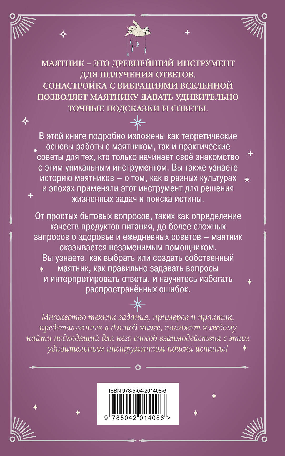Маятник - это древнейший инструмент для получения ответов. Сонастройка с вибрациями Вселенной позволяет маятнику давать удивительно точные подсказки и советы. В этой книге подробно изложены как теоретические основы работы с маятником, так и практические советы для тех, кто только начинает свое знакомство с этим уникальным инструментом. Вы также узнаете историю маятников - о том, как в разных культурах и эпохах применяли этот инструмент для решения жизненных задач и поиска истины. От простых бытовых вопросов, таких как определение качеств продуктов питания, до более сложных запросов о здоровье и ежедневных советов - маятник оказывается незаменимым помощником. Вы узнаете, как выбрать или создать собственный маятник, как правильно задавать вопросы и интерпретировать ответы, и научитесь избегать распространенных ошибок. Множество техник гадания, примеров и практик, представленных в данной книге, поможет каждому найти подходящий для него способ взаимодействия с этим удивительным инструментом поиска истины!| Издательство | ООО "Издательство "Эксмо" |