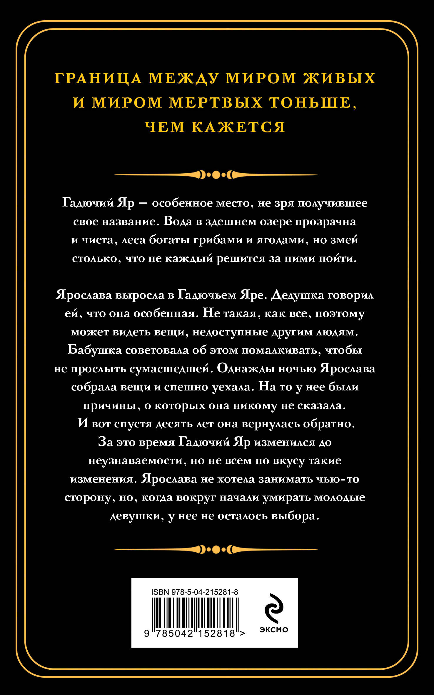 Переиздание от мастера мистического детектива Натальи Тимошенко. Как и в других работах автора, в «Гадючьем яре» вас ждет захватывающий сюжет, нетипичные герои и, конечно, самая неожиданная развязка. Гадючий Яр - особенное место, не зря получившее свое название. Вода в здешнем озере прозрачна и чиста, леса богаты грибами и ягодами, но змей столько, что не каждый решится за ними пойти. Ярослава выросла в Гадючьем Яре. Дедушка говорил ей, что она особенная. Не такая, как все, поэтому может видеть вещи, недоступные другим людям. Бабушка советовала об этом помалкивать, чтобы не прослыть сумасшедшей. Однажды ночью Ярослава собрала вещи и спешно уехала. На то у нее были причины, о которых она никому не сказала. И вот спустя десять лет она вернулась обратно. За это время Гадючий Яр изменился до неузнаваемости, но не всем по вкусу такие изменения. Ярослава не хотела занимать чью-то сторону, но когда вокруг начали умирать молодые девушки, у нее не осталось выбора.| Издательство | ООО "Издательство "Эксмо" |