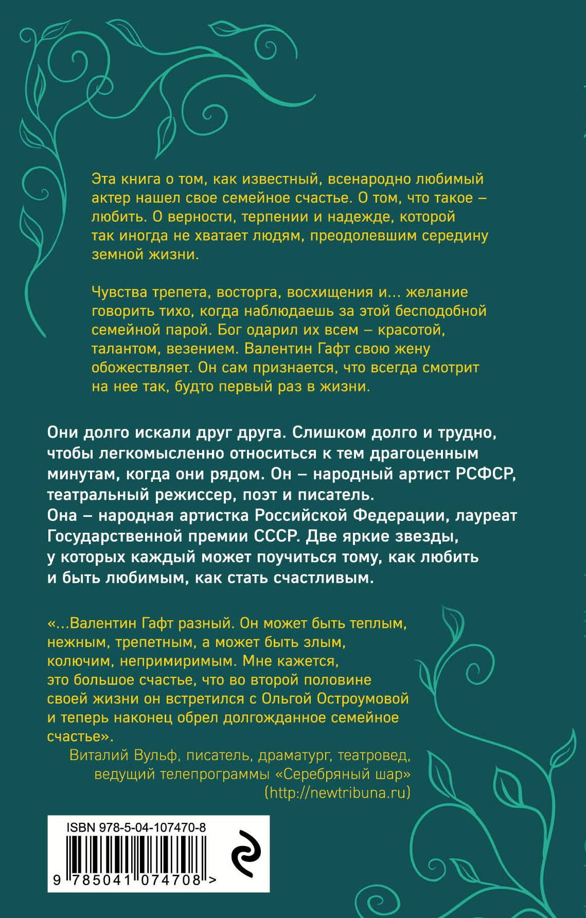 Эта книга о том, как известный, всенародно любимый актер нашел свое семейное счастье. О том, что такое - любить. О верности, терпении и надежде, которой так иногда не хватает людям, преодолевшим середину земной жизни. Чувство трепета, восторга, восхищения и… желание говорить тихо, когда наблюдаешь за этой бесподобной семейной парой. Бог одарил их всем - красотой, талантом, везением. Валентин Гафт свою жену обожествляет. Он сам признается, что всегда смотрит на нее так, будто первый раз в жизни. Они долго искали друг друга. Слишком долго и трудно, чтобы легкомысленно относиться к тем драгоценным минутам, когда они рядом. Он - народный артист РСФСР, театральный режиссёр, поэт и писатель. Она - народная артистка Российской Федерации, Лауреат Государственной премии СССР. Две яркие звезды, у которых каждый может поучиться тому, как любить и быть любимым, как стать счастливым. «…Валентин Гафт разный. Он может быть теплым, нежным, трепетным, а может быть злым, колючим, непримиримым. Мне кажется, это большое счастье, что во второй половине своей жизни он встретился с Ольгой Остроумовой и теперь, наконец, обрел долгожданное семейное счастье». - Виталий Вульф, писатель, драматург, театровед, ведущий телепрограммы «Серебряный шар»| Издательство | ООО "Издательство "Эксмо" |
