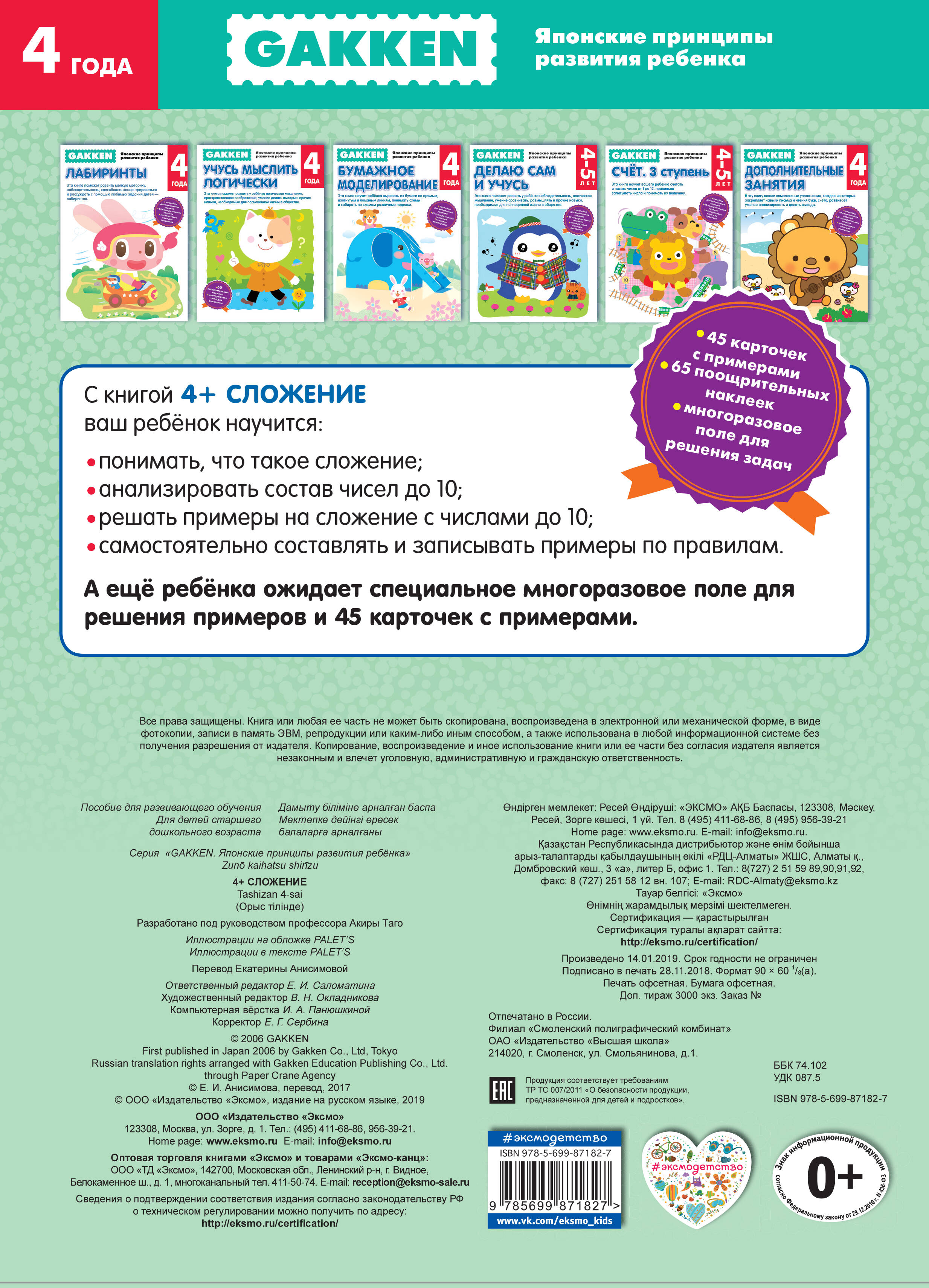 В этой книге даются различные упражнения, начиная от самых основ и до простых вычислений, чтобы ребёнок мог воспринять числа и действия с ними как целостную систему и чтобы сложение стало для него привычным. С удовольствием выполняя упражнения, ребёнок будет закреплять умения, которые станут основой для изучения математики в младшей школе. В книгу входит также вкладка с мотивирующими наклейками и наклейками для заданий, а также 45 карточек с примерами на сложение!| Издательство | ООО "Издательство "Эксмо" |