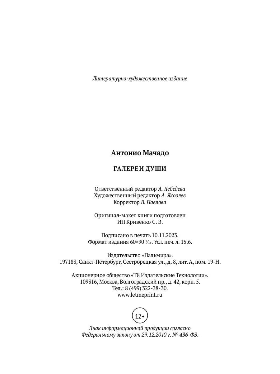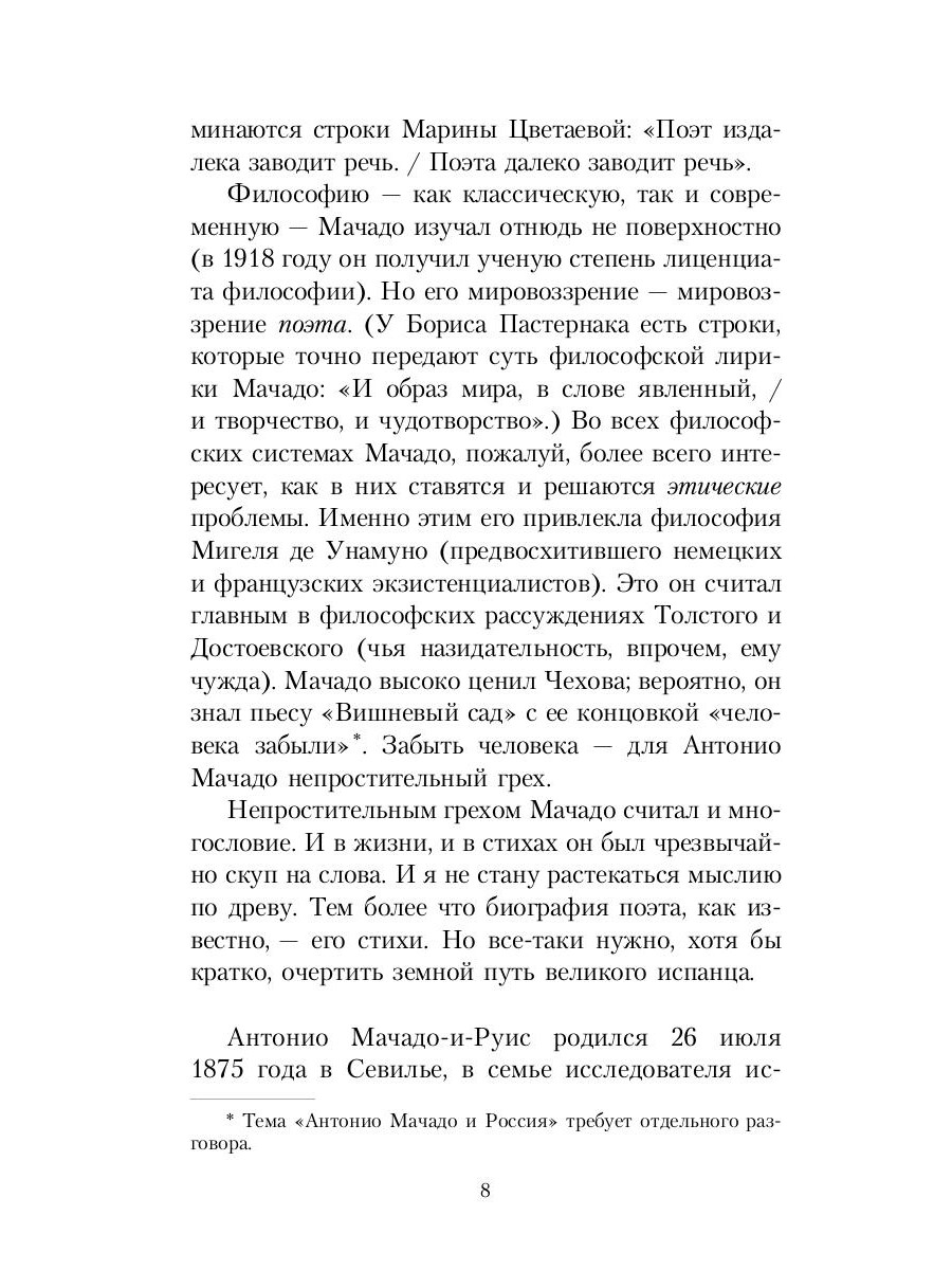 Антонио Мачадо (1875-1939) называют самым значительным испанским поэтом XX столетия. Его современниками были такие прославленные мастера, как Хуан Рамон Хименес, великолепный лирик, виртуоз формы, и Федерико Гарсиа Лорка, с его неповторимой ритмикой и поистине мифологической глубиной, однако именно творчество Мачадо продолжает вновь и вновь притягивать к себе новых испанских поэтов, волна за волной, поколение за поколением. Этот феномен тем более поразителен, что за свою жизнь поэт написал не столь много: стихи были собраны им в один средних размеров том «Poesias completas» («Полное собрание стихотворений»), последнее, наиболее полное издание которого вышло в 1936 году. Неизъяснимое очарование поэзии Мачадо пытались объяснить через понятия символизма, модернизма, народности, религиозности, интегральности и др., однако ее главное свойство - чрезвычайная, до крайности непритязательная простота. Стихи, складывающиеся из немногих точных и выразительных слов, незамысловатые по форме, исключают двусмысленность, называют вещи их прямыми именами - и в этих именах открывают глубину и тайну мира. Настоящее издание представляет собой двуязычный сборник избранных произведений Антонио Мачадо, поэта удивительной строгости духа и редчайшей художественной чистоты.| Издательство | Т8 RUGRAM |