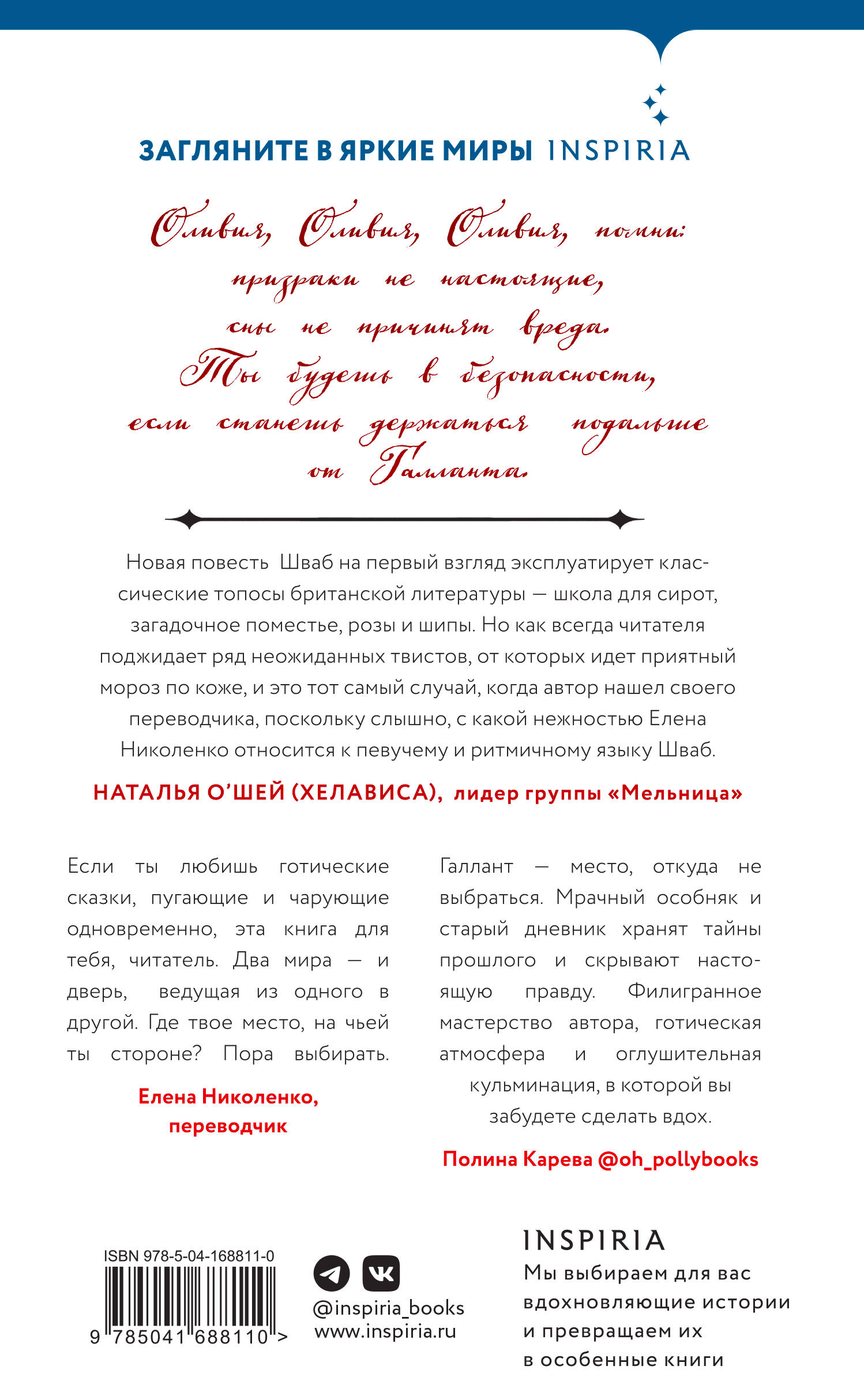 Оливия Приор живёт в школе для девочек-сирот. Она не может говорить, зато умеет видеть призраков. Всё, что осталось у неё от семьи - дневник матери и загадочное предостережение: держись подальше от Галланта. Всё меняется, когда Оливия получает письмо от давно потерянного дяди, который зовёт племянницу домой. Кажется, её мечты сбылись… но когда Оливия прибывает в особняк Приоров, там её никто не ждёт. Дядя мёртв уже год. Кузен хочет, чтобы она ушла. А по коридорам особняка бродит призрак матери, и Оливия хочет знать, что убило её. Кто звал девочку домой. И почему мать не хотела, чтобы Оливия приезжала сюда, в родовое поместье Приоров, имя которому - Галлант… Готическая повесть от автора международного супербестселлера «Незримая жизнь Адди Ларю». Для поклонников «Коралины» Нила Геймана и «Багрового пика» Гильермо дель Торо. Атмосферный бестселлер #1 New York Times. Отважная юная героиня, призраки и особняк, скрывающий страшные тайны за запертыми дверьми. Что прячется по ту сторону? Галлант ждёт вас!| Издательство | ООО "Издательство "Эксмо" |