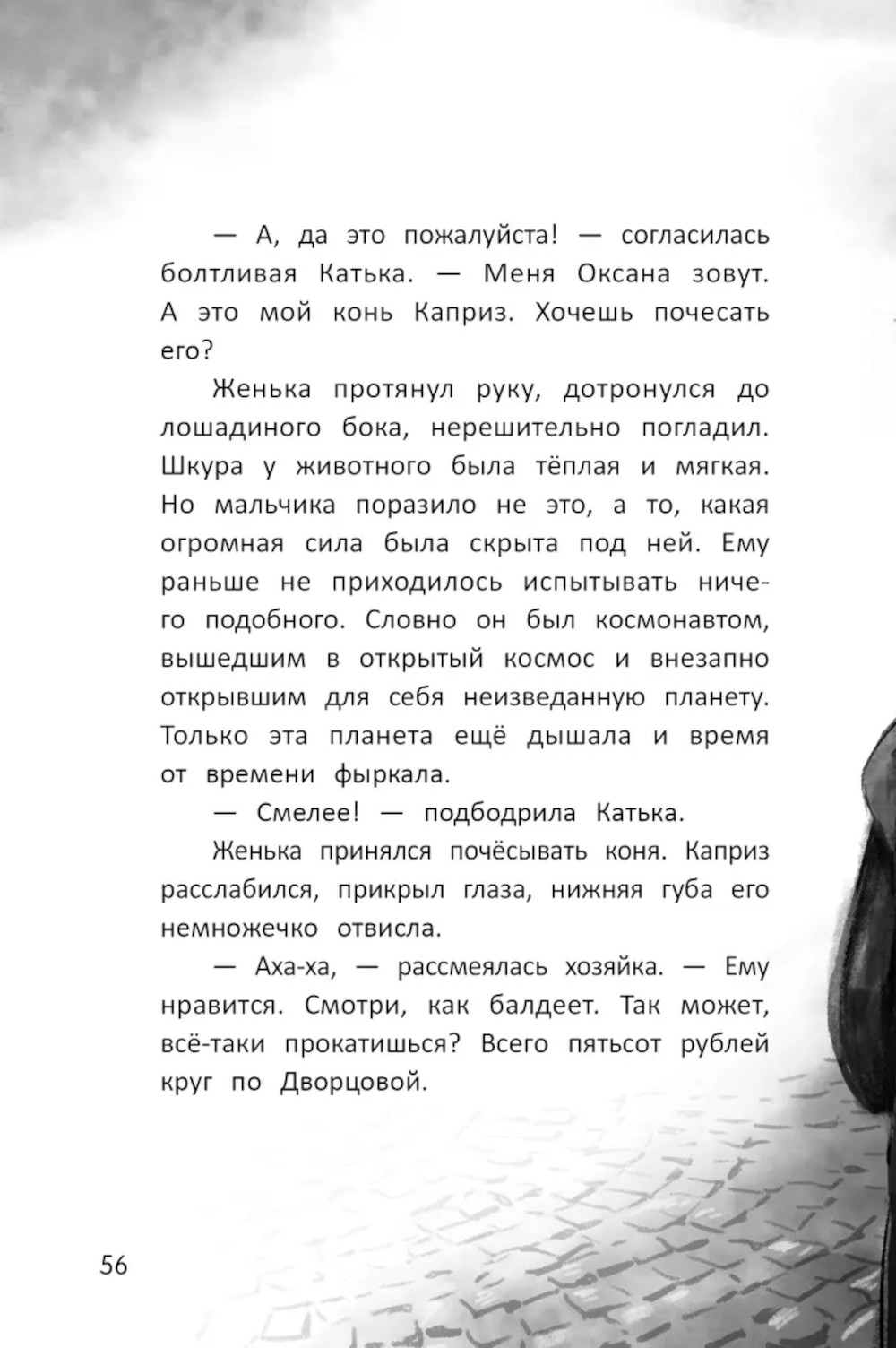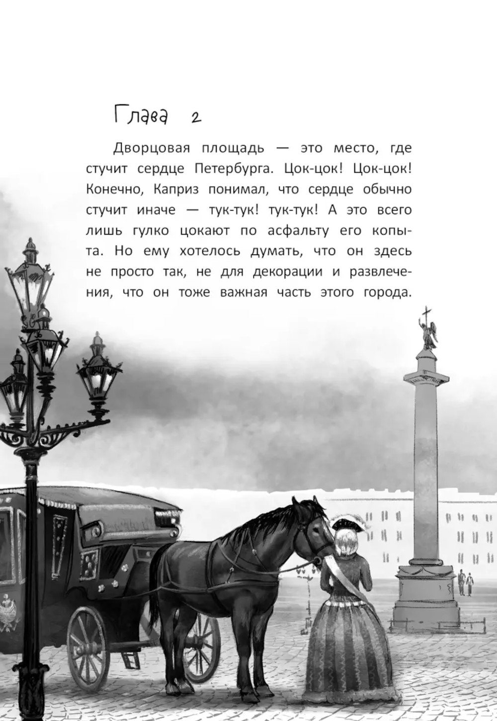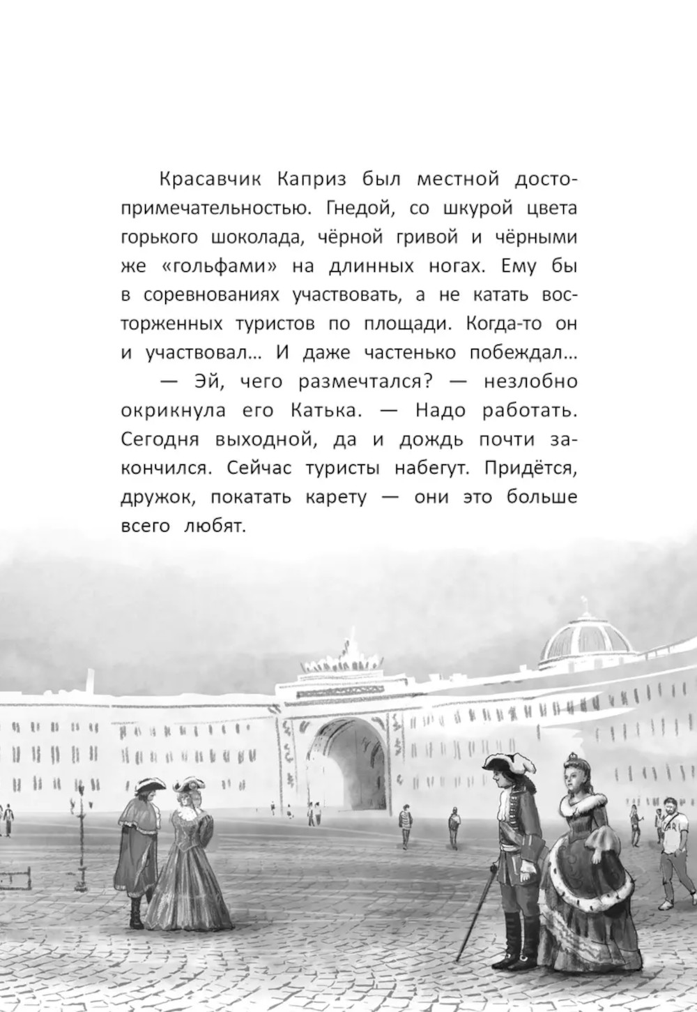 Эта история вместила в себя многое. И атмосферу величественного Петербурга с его гранитными набережными, роскошными дворцами и непревзойдёнными скульптурами. И переживания мальчика, который учится в художественной школе и мечтает помочь своему необычному другу. И стремление к вольной жизни прекрасного коня Каприза, катающего туристов по Дворцовой площади. Эти три мотива переплетаются воедино, чтобы дополнить друг друга и дать повод для размышлений. Правда ли, что даже один маленький человек в силах совершить большое добро? Всегда ли рядом оказываются те, кто может помочь? И нужно ли иногда отпустить того, кого любишь, чтобы сделать его счастливым?| Издательство | Феникс |