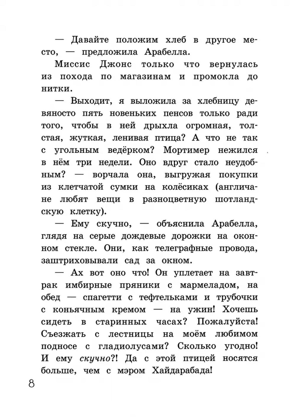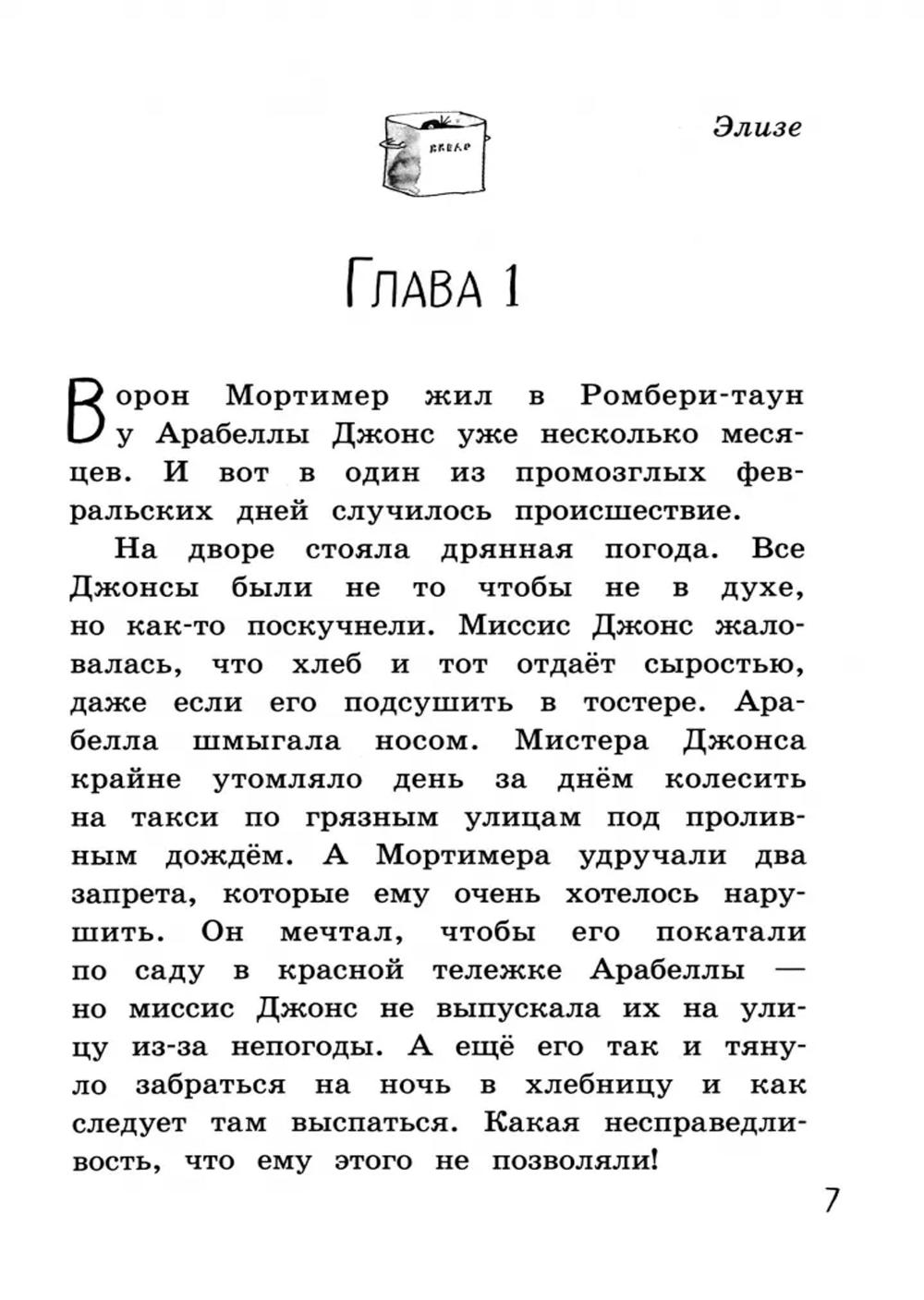 Приключения Арабеллы и Мортимера продолжаются! Ворон птица капризная: Мортимеру обязательно нужно спать в хлебнице и укрываться зеленым галстуком, который, кстати, придется заранее остудить в холодильнике, иначе Мортимер будет расстроен. Арабелла всегда рядом, чтобы позаботиться о нём. Но стоит этим неразлучникам разделиться, как тут же начинаются неприятности: светофоры исчезают, папа падает в обморок, а рояль тонет в море. Веселые рисунки Квентина Блейка прекрасно дополняют текст, а чуткий перевод Елены Мамонтовой как нельзя лучше передает тонкий юмор автора.