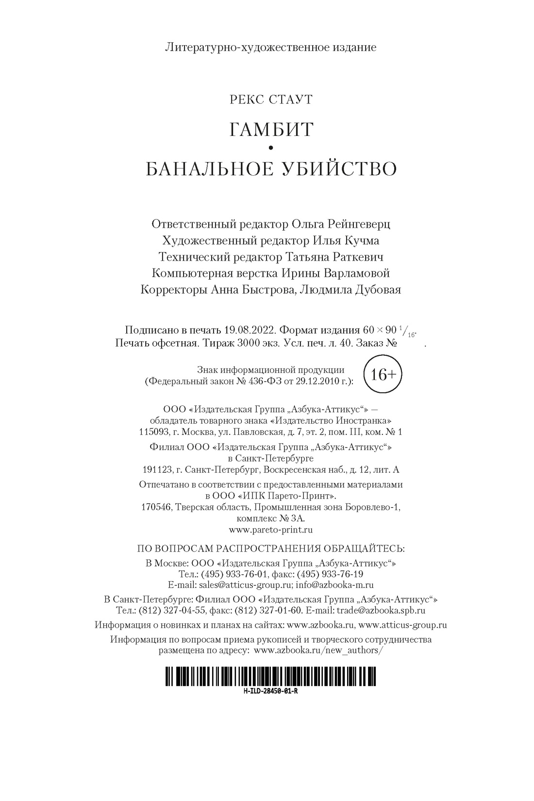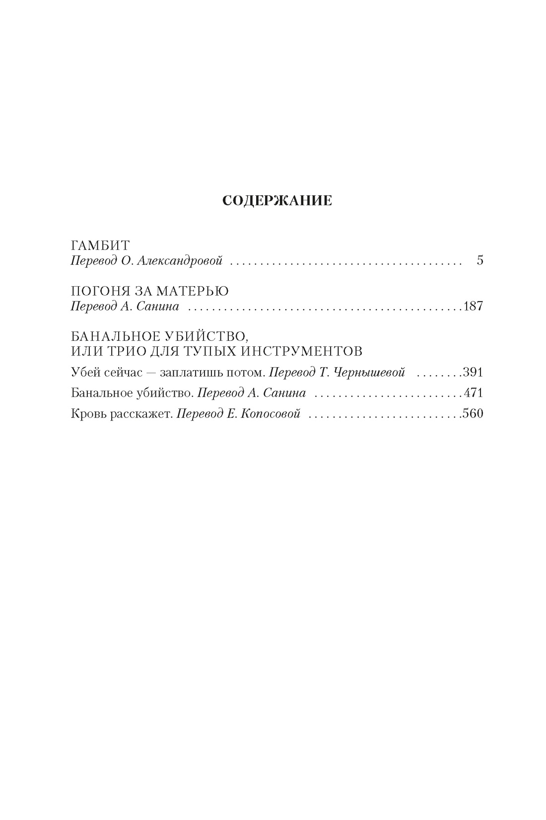 Ниро Вулф, страстный коллекционер орхидей, большой гурман, любитель пива и великий сыщик, практически никогда не выходит из дому. Все преступления он распутывает на основе тех фактов, которые собирает Арчи Гудвин, его обаятельный, ироничный помощник с отличной памятью. В элитном шахматном клубе во время сеанса одновременной игры отравлен талантливый шахматист Пол Джерин, и подозрение падает на одного из участников. Однако его дочь уверена в невиновности отца и просит Вулфа найти настоящего убийцу… Люси Вэлдон, вдове успешного писателя, подкидывают младенца с запиской, в которой говорится, что отцом этого младенца является ее покойный муж. Люси нанимает знаменитого сыщика, чтобы тот нашел мать ребенка. Но стоило Вулфу начать поиски, как убивают главного свидетеля… Кроме романов «Гамбит» и «Погоня за матерью», в книгу вошли три повести, в которых Вулф принимается за расследование, чтобы доказать невиновность чистильщика обуви, снять обвинения с Арчи, которого подставила его знакомая, а заодно в очередной раз сказать полиции, что она идет по неверному следу.| Издательство | Иностранка |
