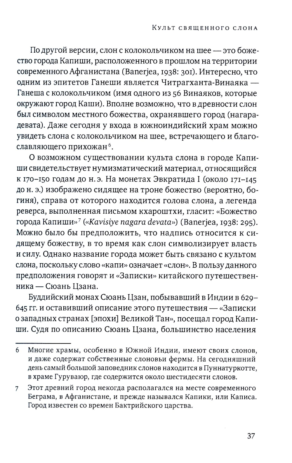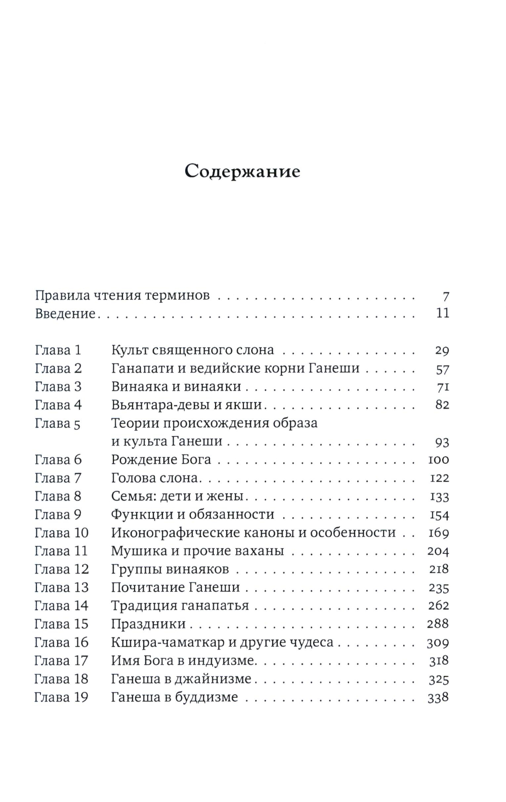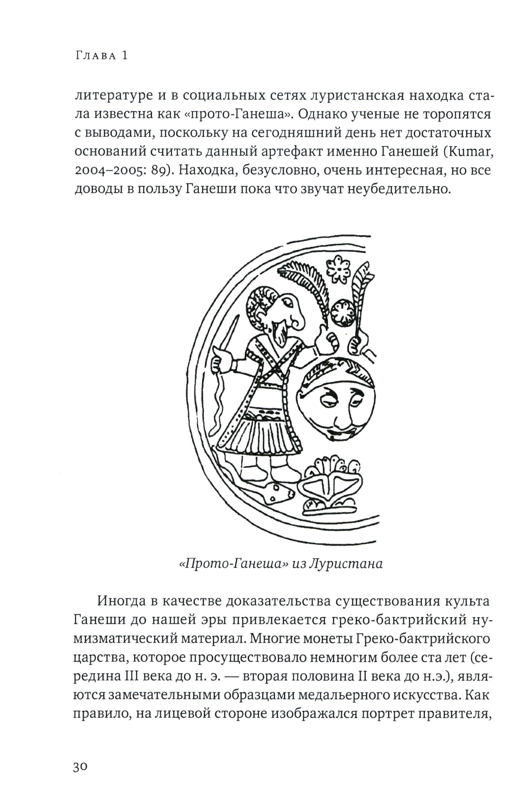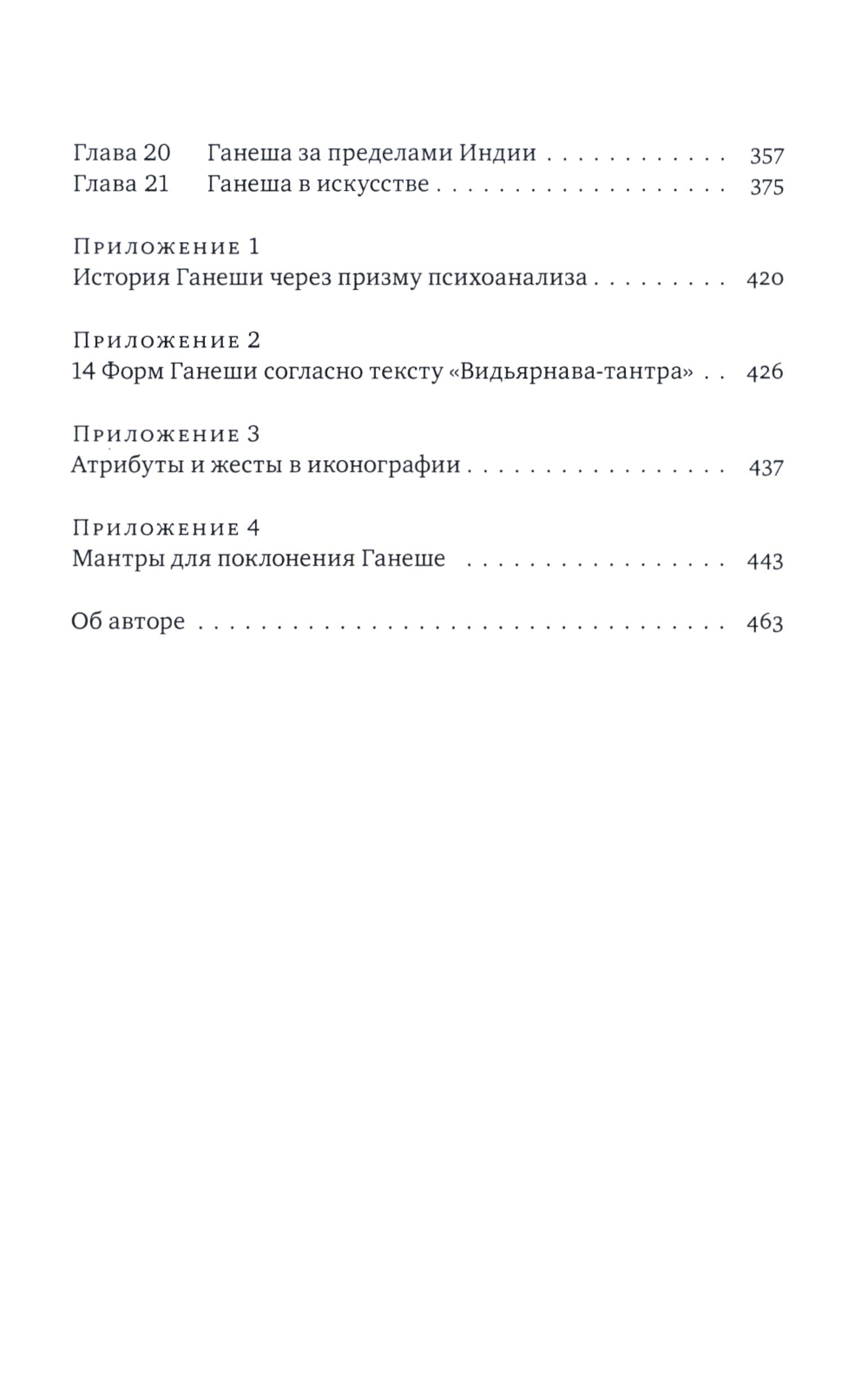 В книге на разнообразном материале прослеживается возникновение культа и образа Ганеши, его истоки и мифологическая история (в частности, история появления на свет и отношения с семьей, причины его необычной внешности и вопросы, касающиеся женитьбы и отцовства), рассматриваются основные функции и особенности его почитания, иконографические каноны, атрибуты и символика, уделяется внимание особенностям его изображения в искусстве, а также то положение, которое Ганеша занимает в джайнизме и буддизме. В приложении читатель сможет ознакомиться с примером применения психоанализа в индологических исследованиях, с иконографическими нюансами и основными мантрами, которые используются для поклонения Ганеше.
