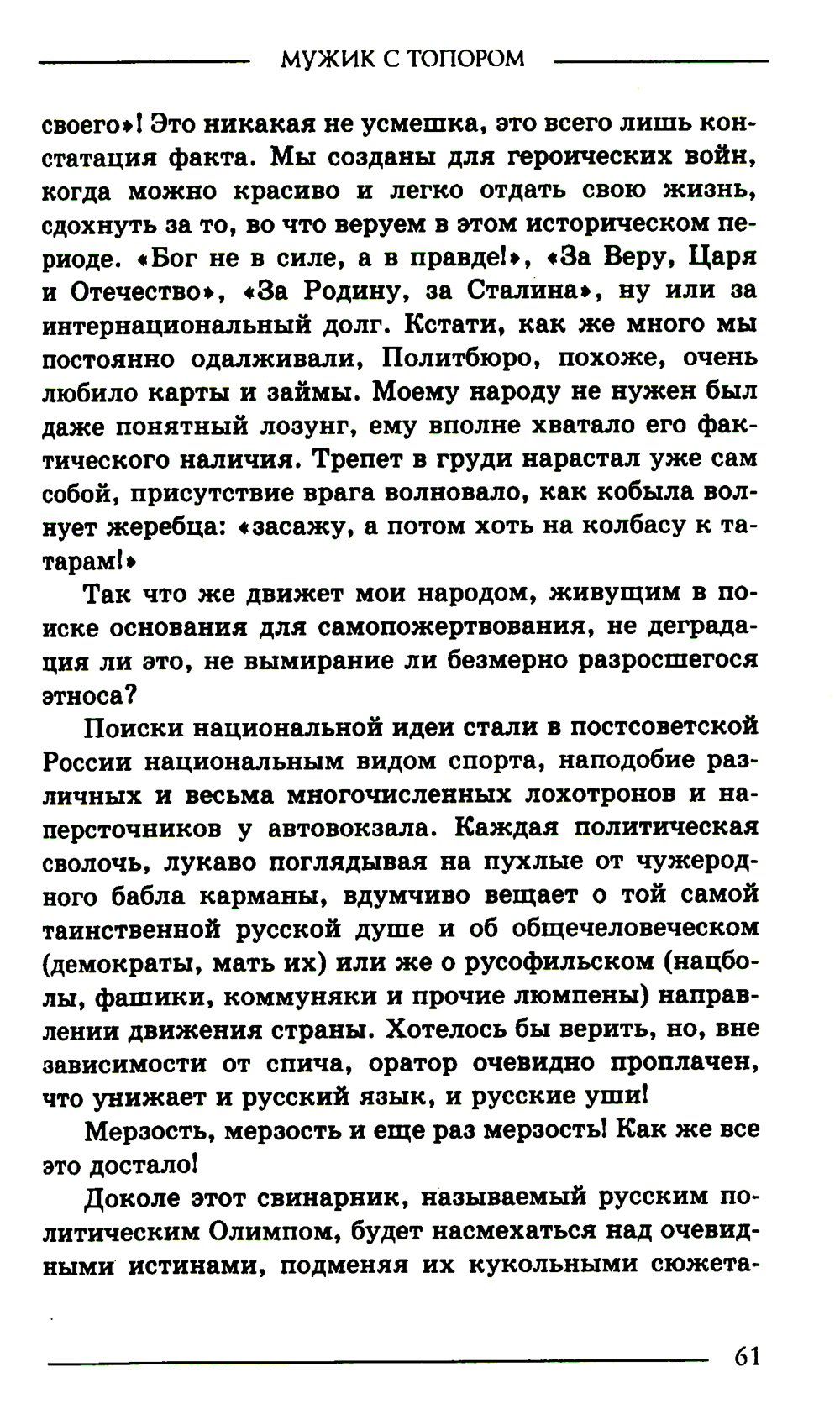 Комплект из 2 книг. «Мужик с топором»: В Ваших руках 10-й тираж самой простой и искренней книги о том, каким должен быть Мужчина на Русской улице. Книга говорит не об авторе. Вы удивитесь, книга написана о Вас. Автор - обычный Русский парень, родившийся в неспокойном пригороде Челябинска, самым страшным испытанием которого было его детство... Которое научило его очевидным формулам: отсутствие выбора - крайне упрощает выбор! Мужчина должен быть Воином, в противном случае его Родину ждёт оккупация, его семью - плен, а имя его - позор! «Гарантии личной безопасности»: Чувствуете ли вы себя в безопасности? Если да, то вы - счастливый человек, но чувствуете вы себя так совершенно напрасно. Знаете ли вы: - что делать с душевнобольным соседом; - что такое «цыганский гипноз» и как подавляют жертву уголовники; - чем опасны коучи с тёмной харизмой на бизнес-тренингах и курсах личностного роста; - как вести себя в такси, в поезде, в самолёте, а также после ДТП, чтобы не влипнуть в неприятности; - как уберечь свой телефон и заодно себя от кибератак мошенников; - как вести себя с агрессивной собакой и стаей голодных врачей; - как умыть коллектора холодной мочой и самому не стать коллектором; - чем конкретно дефективны эффективные менеджеры и как с ними бороться; - как избавиться от волнения, страха и мандража? Мир полон опасностей, но в нём ещё больше путей для обхода ловушек. «Где же гарантии личной безопасности?» - спросите вы. В этой книге!| Издательство | Крылов |