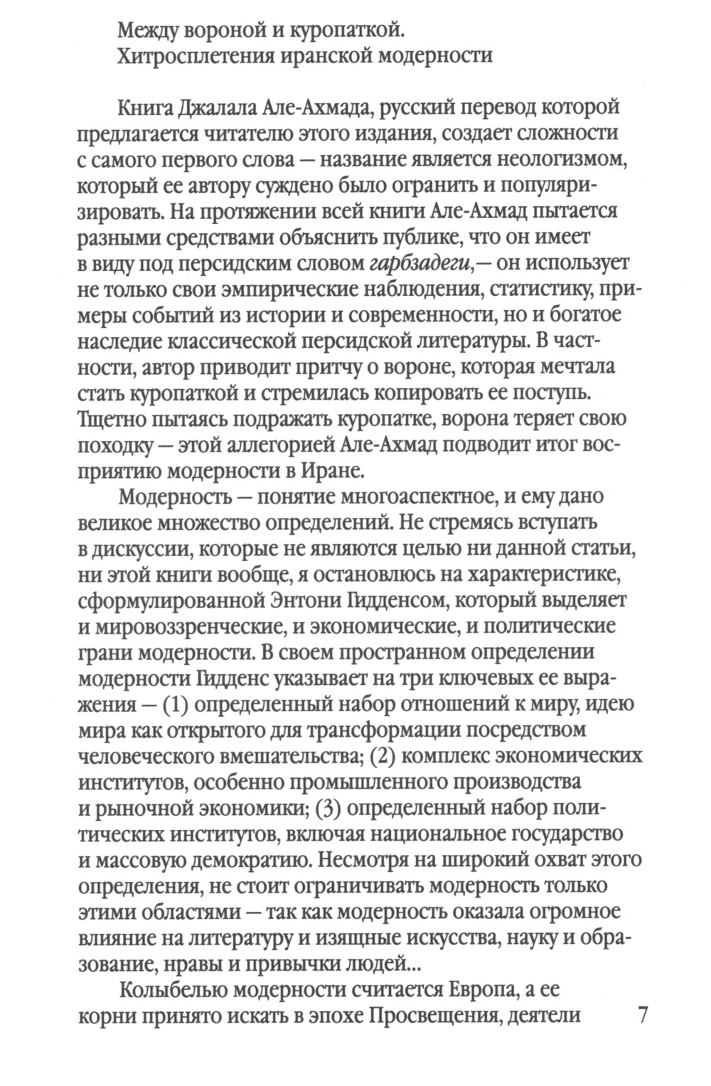 Полемичное эссе Джалала Але-Ахмада (1923-1969) получило всемирную известность и было переведено на многие языки. В нем внутренние проблемы Ирана рассмотрены сквозь призму неравноценных отношений страны с Западом. Термин «гарбзадеги» - буквально переводящийся с фарси как «поражение Западом» - Але-Ахмад перенял у иранского мыслителя Ахмада Фардида и придал ему значение, которое стало основным,- технологическая, культурная и идеологическая зависимость Ирана от Запада. Это эссе ошибочно трактуют как исламистский текст, однако «Гарбзадеги» критикует колониализм, но не прогресс как таковой. В наши дни, когда противостояние идеологий глобализма и антиглобализма не теряет актуальности, а вопросы поиска постколониальной национальной идентичности остаются чувствительными, работа Але-Ахмада будет интересна широкому кругу читателей.| Издательство | Ад Маргинем Пресс |