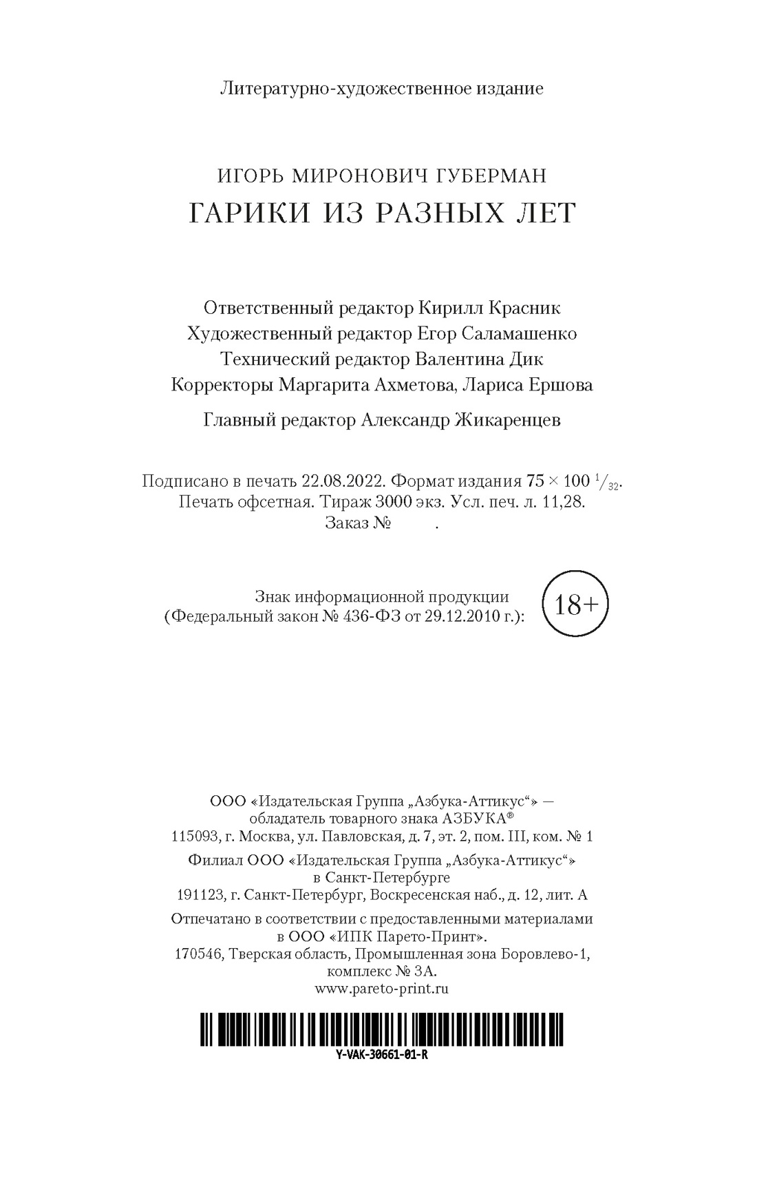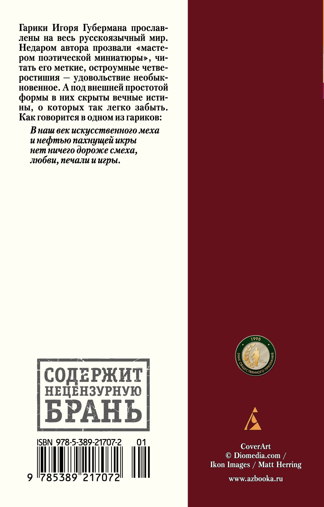 Гарики Игоря Губермана прославлены на весь русскоязычный мир. Недаром автора прозвали «мастером поэтической миниатюры», читать его меткие, остроумные четверостишия - удовольствие необыкновенное. А под внешней простотой формы в них скрыты вечные истины, о которых так легко забыть. Как говорится в одном из гариков: В наш век искусственного меха и нефтью пахнущей икры нет ничего дороже смеха, любви, печали и игры.| Издательство | Азбука |