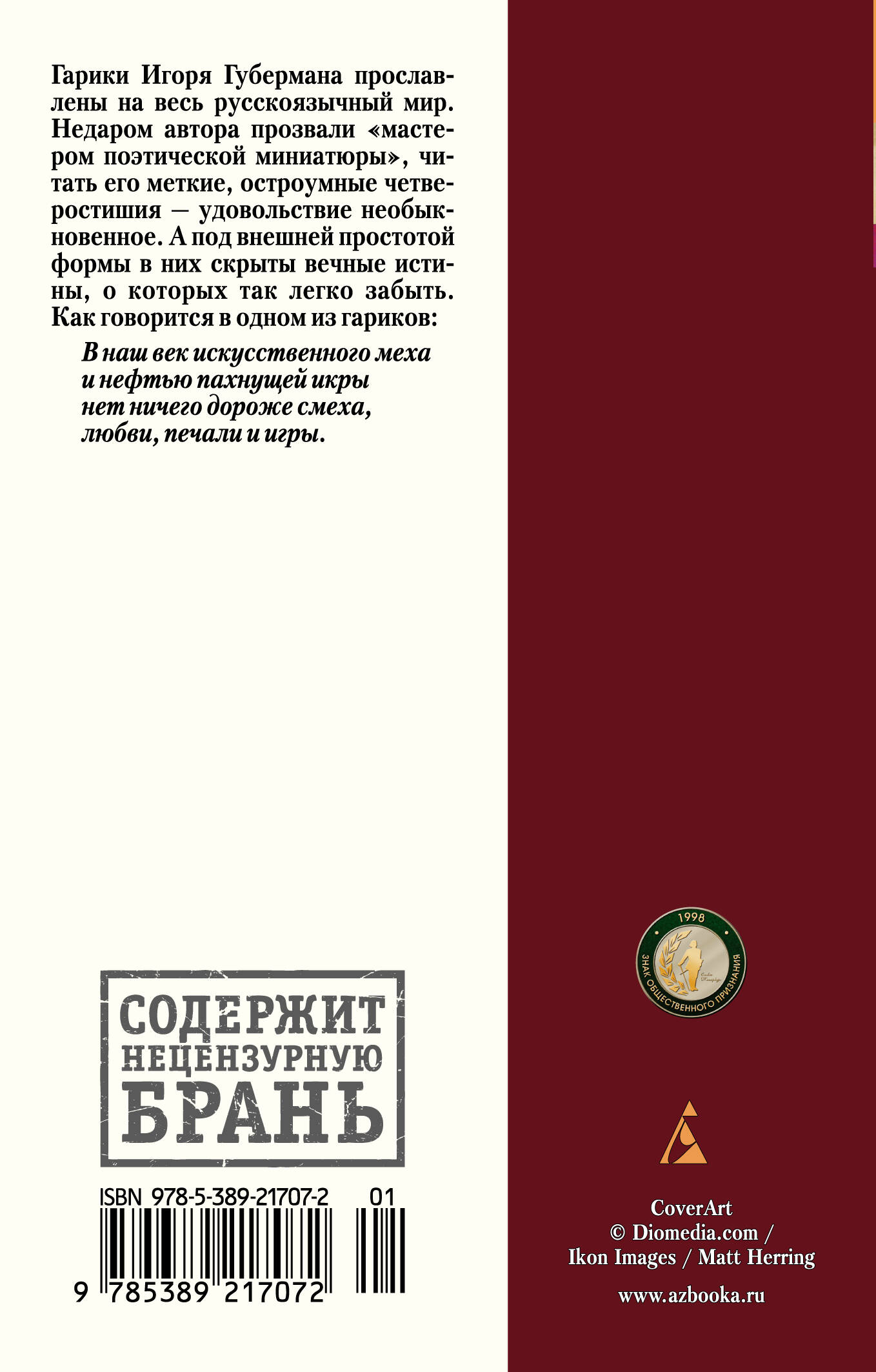 Гарики Игоря Губермана прославлены на весь русскоязычный мир. Недаром автора прозвали "мастером поэтической миниатюры", читать его меткие, остроумные четверостишия - удовольствие необыкновенное. А под внешней простотой формы в них скрыты вечные истины, о которых так легко забыть. Как говорится в одном из гариков: В наш век искусственного меха и нефтью пахнущей икры нет ничего дороже смеха, любви, печали и игры.| Издательство | Азбука-Аттикус Издат.группа ООО |