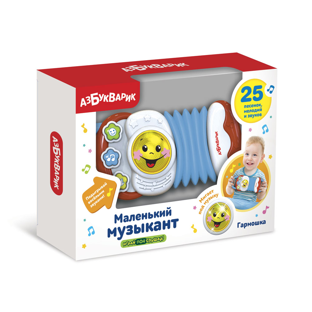 Яркая игрушечная гармошка подарит малышу отличное настроение и поможет ему раскрыть музыкальный талант! Нажимай на кнопочки - слушай 25 песенок, мелодий и звуков («Антошка», «Дождик», «Пусть бегут неуклюже», «Как у наших у ворот», «Мишка косолапый», «Зайчик серенький сидит», «Идет коза рогатая», «Сидит белка на тележке», «Калинка», «Два весёлых гуся» и др.) Во время звучания песенок и мелодий мигает огонек. А еще можно подыграть под музыку весёлыми звуками, как диджей: для этого нужно нажимать на большую желтую кнопку. Получится настоящий концерт!