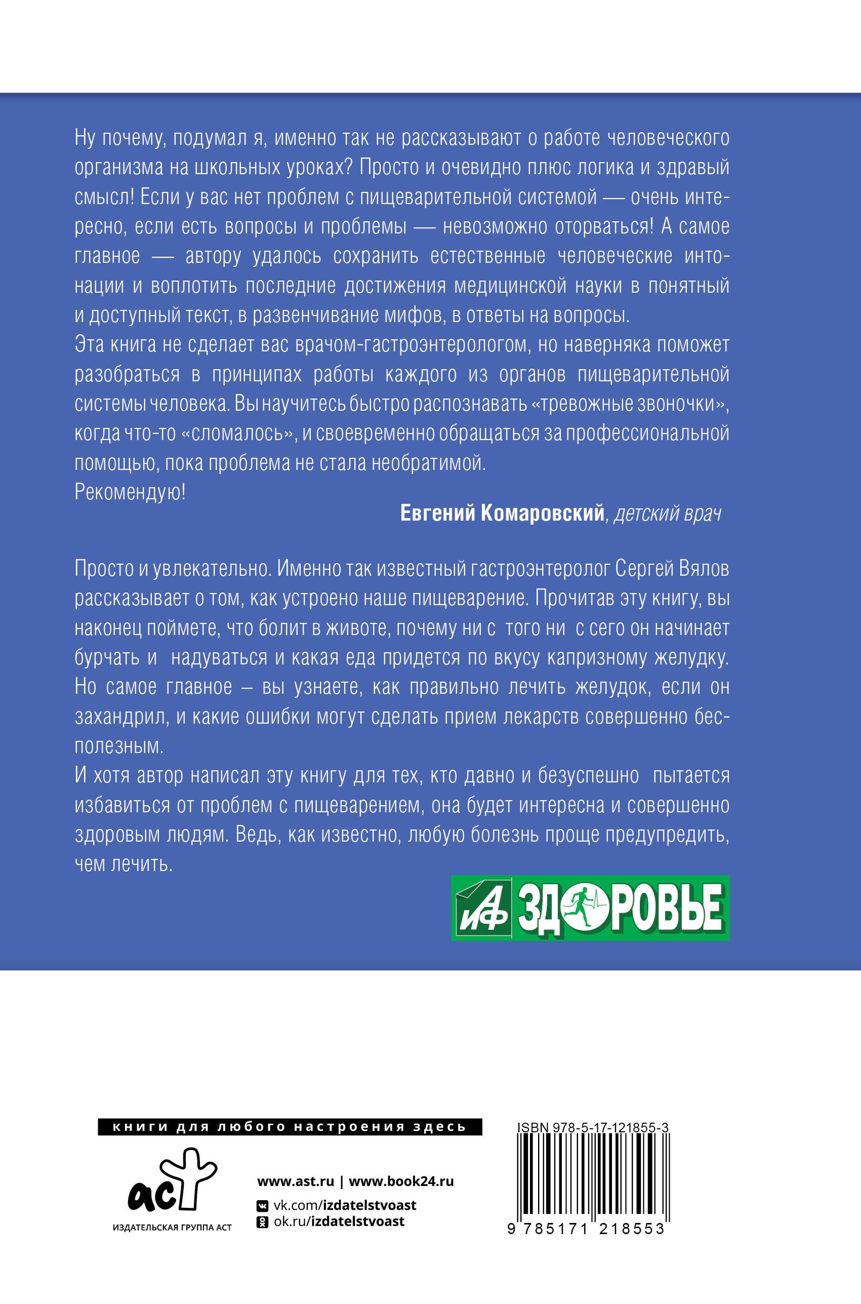 Перед вами не учебник для врачей и не инструкция по лечению всех болезней. Эта книга просто и доступно поможет разобраться в принципах работы пищеварения и понять, что именно пошло не так. Автор привлекает внимание к наиболее частым ошибкам и практическим трудностям, которые возникают на пути от начала заболевания к выздоровлению. Вы узнаете о пищеварении если не все, то очень много. А зная, как работают желудок, печень и кишечник, становится проще понимать, что именно нужно сделать для их восстановления. Сергей Вялов - врач-гастроэнтеролог с международной квалификацией и опытом работы в Германии, гепатолог, кандидат медицинских наук, медицинский консультант телепрограмм "О самом главном", "Я худею", "Контрольная закупка" и других на федеральных телеканалах (Первый, Россия, НТВ). В его активе более 160 научных статей и более 20 книг для врачей. Берите на вооружение только проверенную информацию, берегите себя и будьте здоровы!| Издательство | ИЗДАТЕЛЬСТВО "АСТ" |