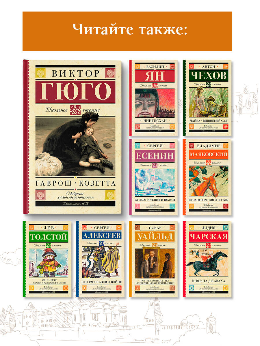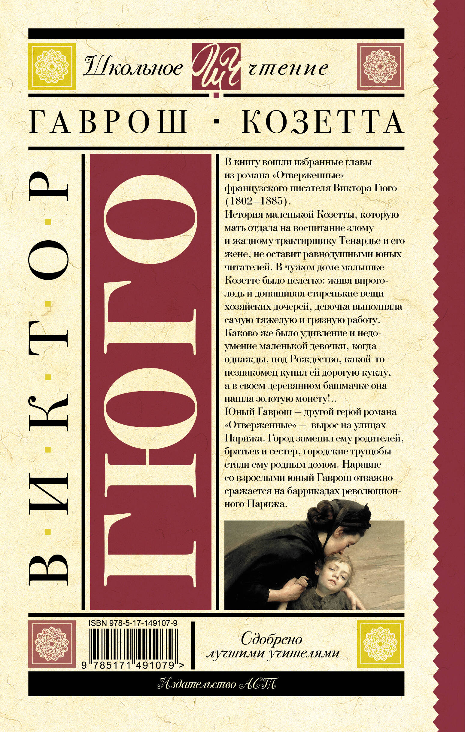 В книгу вошли избранные главы из романа «Отверженные» французского писателя Виктора Гюго (1802-1885). История маленькой Козетты, которую мать отдала на воспитание злому и жадному трактирщику Тенардье и его жене, не оставит равнодушными юных читателей. В чужом доме малышке Козетте было нелегко: живя впроголодь и донашивая старенькие вещи хозяйских дочерей, девочка выполняла самую тяжелую и грязную работу. Каково же было удивление и недоумение маленькой девочки, когда однажды, под Рождество, какой-то незнакомец купил ей дорогую куклу, а в своём деревянном башмачке, она нашла золотую монету!.. Юный Гаврош - другой герой романа «Отверженные» - вырос на улицах Парижа. Город заменил ему родителей, братьев и сестер, городские трущобы стали ему родным домом. Наравне со взрослыми юный Гаврош отважно сражается на баррикадах революционного Парижа. Главы романа, вошедшие в книгу, входят в программу для обязательного чтения в начальной ьшколе.| Издательство | АСТ |