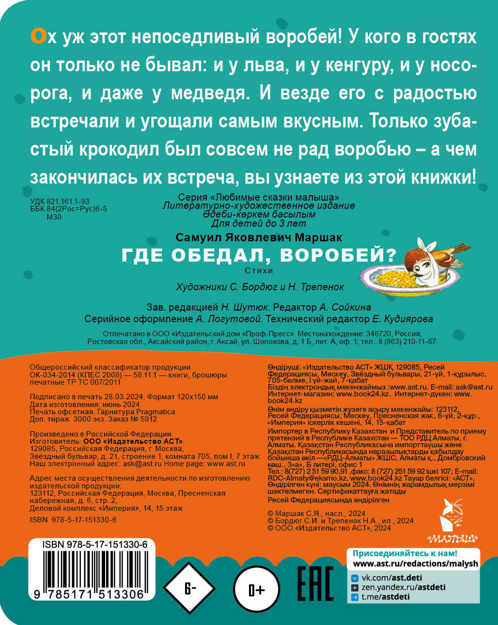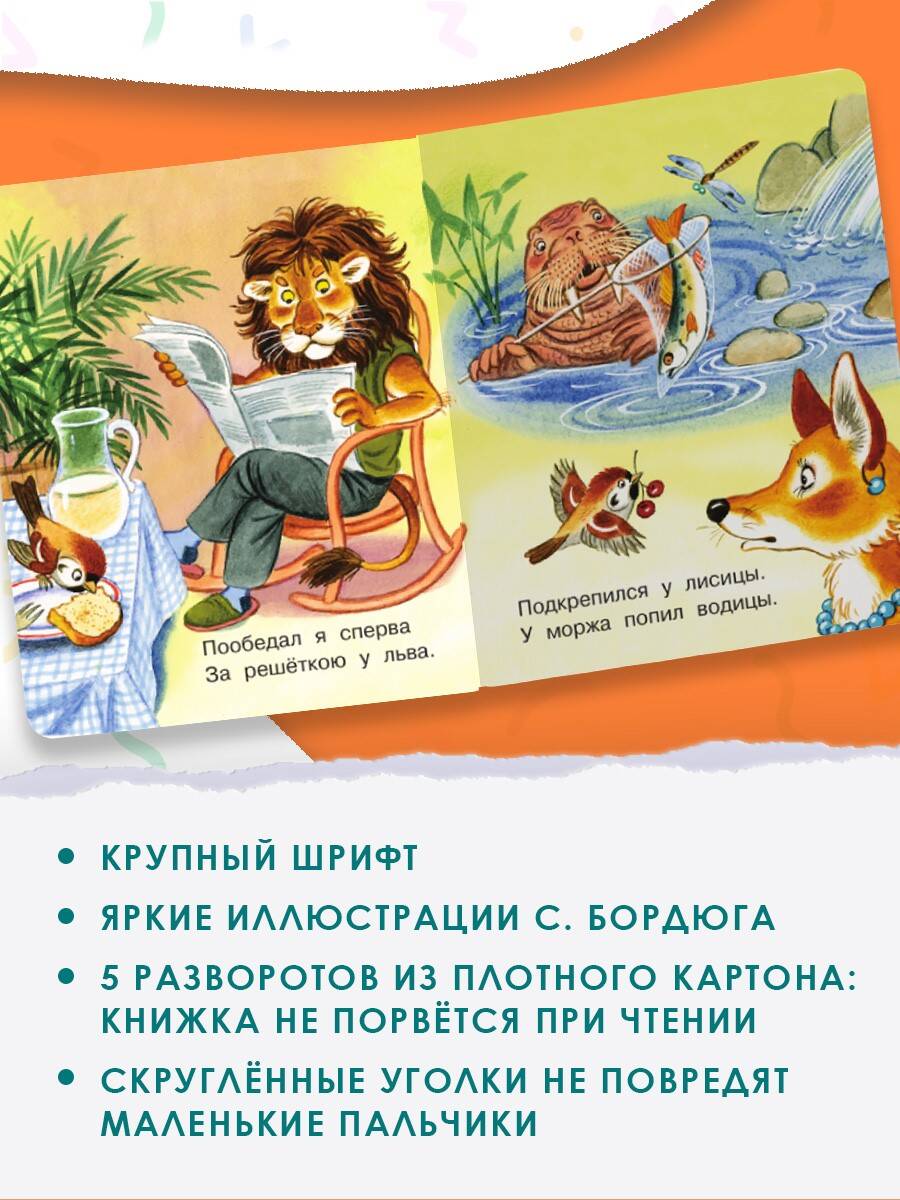 Ох уж этот непоседливый воробей! У кого в гостях он только не бывал: и у льва, и у кенгуру, и у носорога, и даже у медведя. И везде его с радостью встречали и угощали самым вкусным. Только зубастый крокодил был совсем не рад воробью - а чем закончилась их встреча, вы узнаете из этой книжки! Самуил Яковлевич Маршак - классик отечественной детской литературы. Его стихотворение "Где обедал, воробей?" особенно нравится маленьким читателям, ведь оно смешное, ритмичное и легко запоминается. А еще в этой книжке каждой фразе из стихотворения соответствует иллюстрация, и историю можно проследить по картинкам. Эта книга предназначена именно для малышей: в ней яркие рисунки и крупные буквы, плотный картон не порвется при чтении, а скругленные уголки не повредят маленькие пальчики.| Издательство | Издательство "АСТ" |