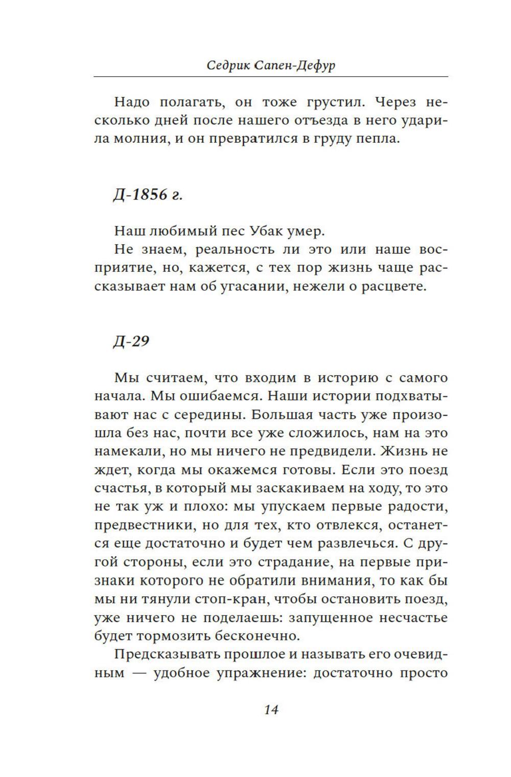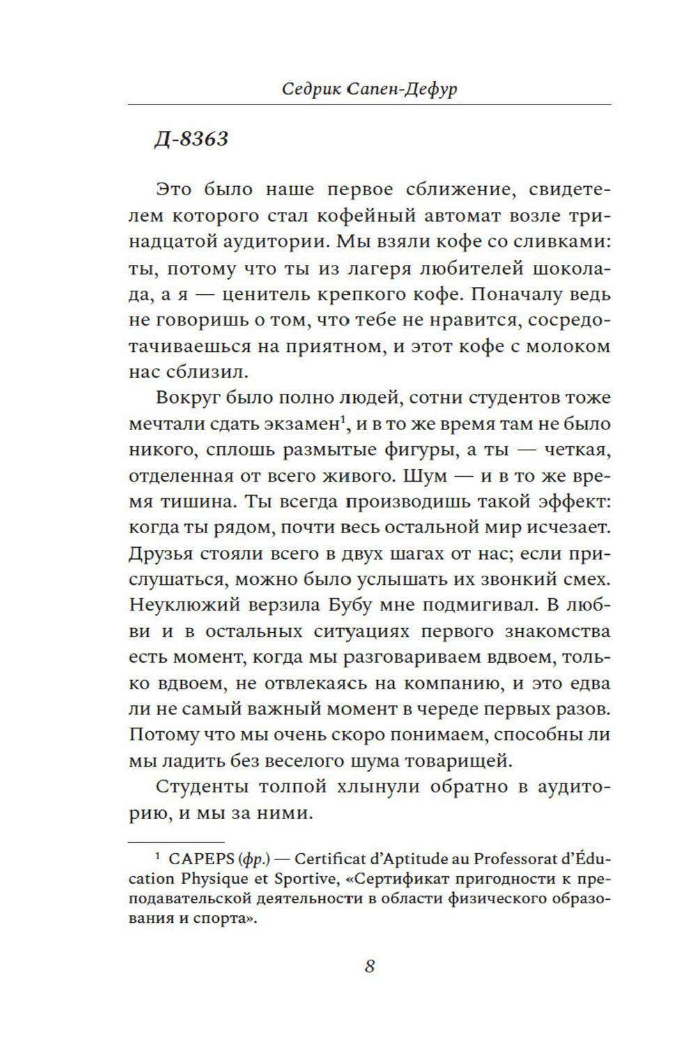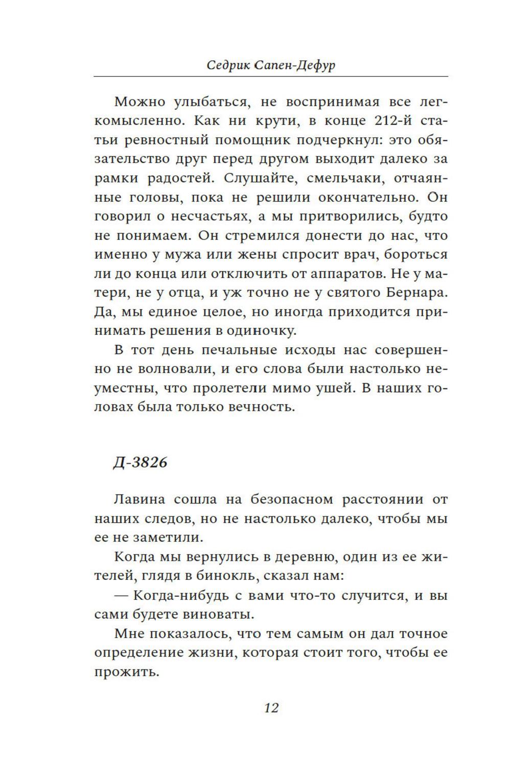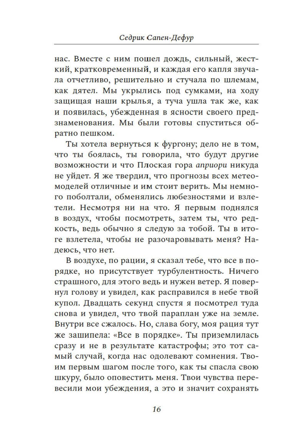 Двенадцатое августа 22го года - тот самый день Д, который стал для обоих испытанием. Ранним солнечным утром семейная пара наслаждается незабываемым моментом - полетом на парапланах над сверкающей долиной. Они спокойны и безмятежны, их жизнь похожа на жизнь всех людей в счастливом браке. Седрик и Матильда. Два человека, беззаветно любящие жизнь, горы, друг друга. На мгновение Седрик отвлекается, и этой секунды достаточно, чтобы потерять Матильду из виду. Где она? Упала на скалы? Жива ли она?.. Задыхаясь, Седрик бежит к месту падения ее параплана. Он и подумать боится о том, что этот полет может стать для Матильды последним... Седрик Сапен-Дефур написал искреннюю и трогательную книгу о своей жене Матильде, о всесильной и всепобеждающей любви, о несчастном случае, который разделил их жизнь на до и после, о месяцах восстановления, о слезах, боли и, в конце концов, надежде.| Издательство | КоЛибри |
