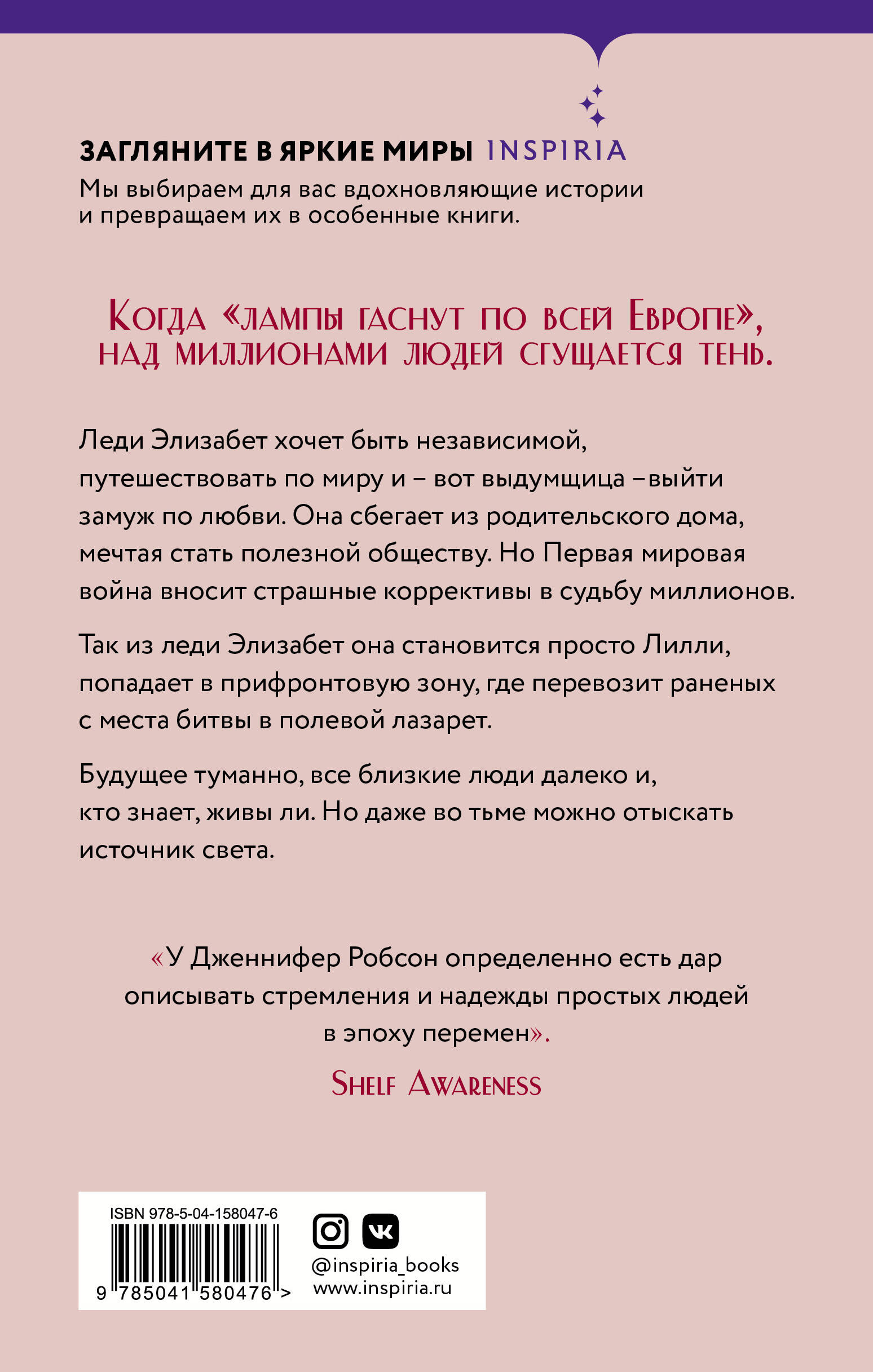 НОВИНКА ОТ АВТОРА РОМАНА «ПЛАТЬЕ КОРОЛЕВЫ»! Эти годы безвозвратно изменили роль женщин во всем мире. Когда «лампы гаснут по всей Европе», над миллионами людей сгущается тень... Леди Элизабет мечтает быть независимой, путешествовать по миру и - вот выдумщица - выйти замуж по любви. Она сбегает из родительского дома, мечтая стать полезной обществу. Но Первая мировая война вносит страшные коррективы в судьбу миллионов. Так из леди Элизабет она становится просто Лилли, попадает в прифронтовую зону, где перевозит раненых с места битвы в полевой лазарет. Будущее туманно, все близкие люди далеко и, кто знает, живы ли. Но даже во тьме можно отыскать источник света. «У Дженнифер Робсон определенно есть дар описывать стремления и надежды простых людей в эпоху перемен». - Shelf Awareness| Издательство | ООО "Издательство "Эксмо" |