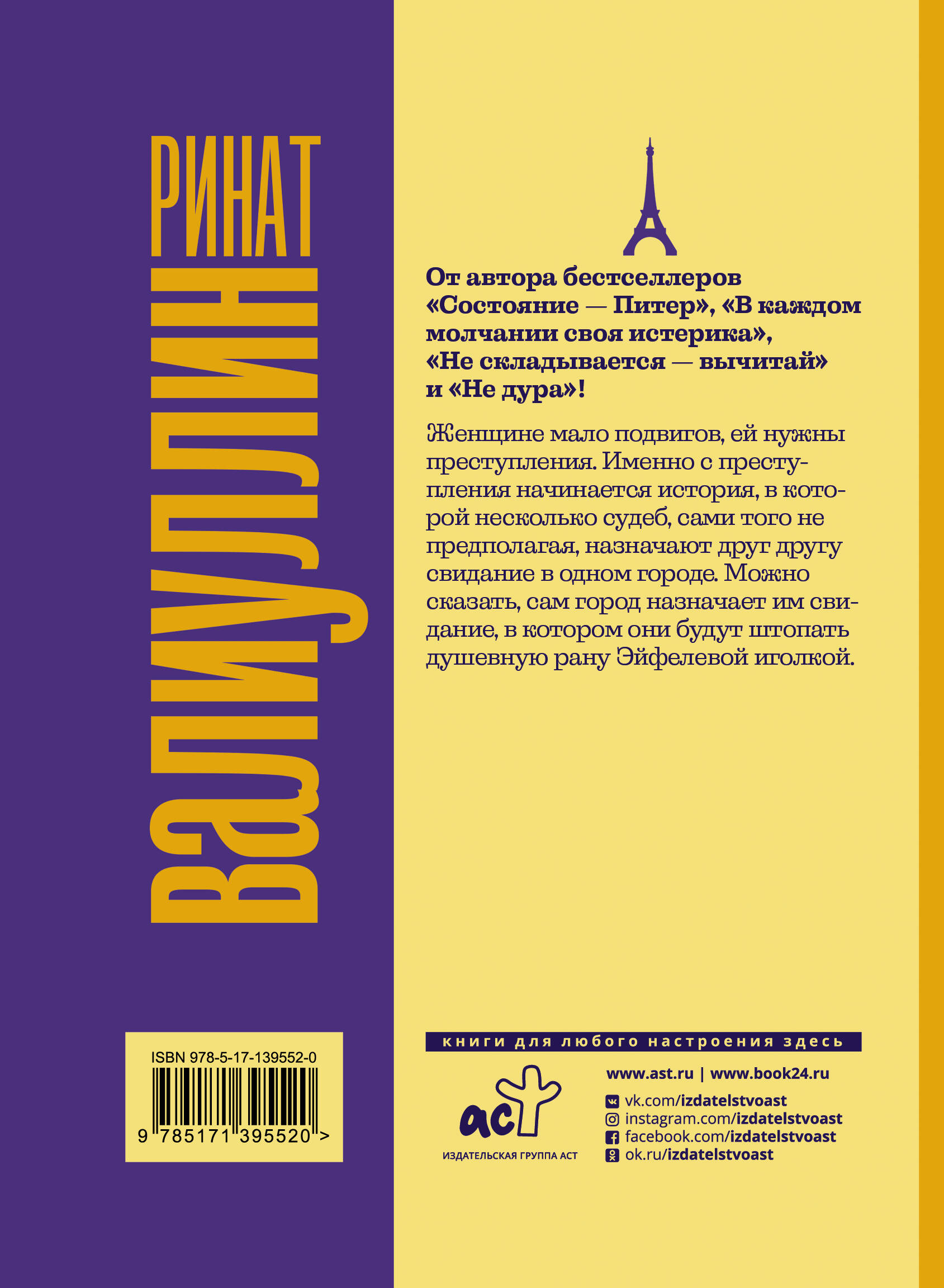 Женщине мало подвигов, ей нужны преступления. Именно с преступления начинается история, в которой несколько судеб, сами того не предполагая, назначают друг другу свидание в одном городе. Можно сказать, сам город назначает им свидание, в котором они будут штопать душевную рану Эйфелевой иголкой.| Издательство | ИЗДАТЕЛЬСТВО "АСТ" |
