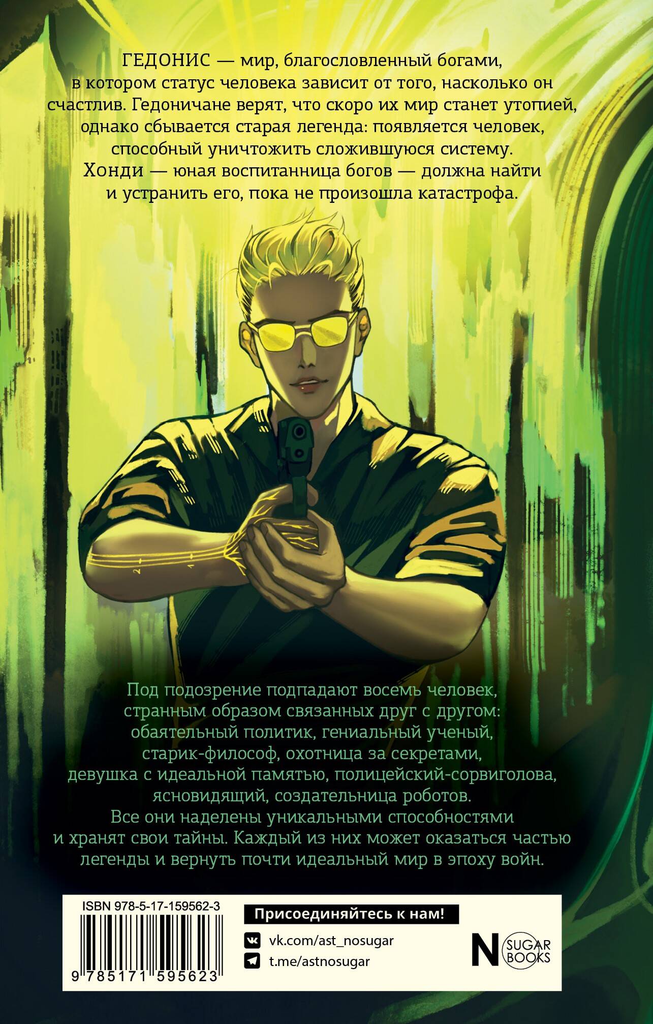 Гедонис - мир, благословленный богами, в котором статус человека зависит от того, насколько он счастлив. Гедоничане верят, что скоро их мир станет утопией, однако сбывается старая легенда - появляется человек, способный уничтожить сложившуюся систему. Хонди - юная воспитанница богов - должна найти и устранить его, пока не произошла катастрофа. Под подозрение подпадают восемь человек, странным образом связанных друг с другом: обаятельный политик, гениальный ученый, старик-философ, охотница за секретами, девушка с идеальной памятью, полицейский-сорвиголова, ясновидящий, создательница роботов. Все они наделены уникальными способностям и хранят свои тайны. Каждый из них может оказаться частью легенды и вернуть почти идеальный мир в эпоху войн.| Издательство | Издательство "АСТ" |