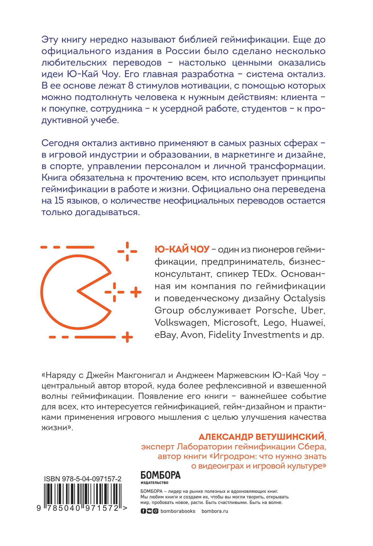 Эту книгу называют библией геймификаци. Еще до официального издания в России было сделано несколько любительских переводов - настолько ценными оказались идеи Ю-Кай Чоу. Его главная разработка - система октализ. В ее основе лежат 8 стимулов мотивации, с помощью которых можно подтолкнуть человека к нужным действиям: клиента - к покупке, сотрудника - к усердной работе, студентов - к продуктивной учебе. Сегодня октализ активно применяют в самых разных сферах - в игровой индустрии и образовании, в маркетинге и дизайне, в спорте, управлении персоналом и личной трансформации. Книга обязательна к прочтению всем, кто использует принципы геймификации в работе и жизни. Официально она переведена на 15 языков, о количестве неофициальных переводов остается только догадываться. Ю-Кай Чоу - один из пионеров геймификации, предприниматель, бизнес-консультант, спикер TEDx. Основанная им компания по геймификации и поведенческому дизайну Octalysis Group обслуживает Porsche, Uber, Volkswagen, Microsoft, Lego, Huawei, eBay, Avon, Fidelity Investments и другие. «Наряду с Джейн Макгонигал и Анджеем Маржевским, Ю-Кай Чоу - центральный автор второй - куда более рефлексивной и взвешенной - волны геймификации. Появление его книги - важнейшее событие для всех, кто интересуется геймификацией, гейм-дизайном и практиками применения игрового мышления с целью улучшения качества жизни». Александр Ветушинский, эксперт Лаборатории геймификации Сбера, автор книги «Игродром: что нужно знать о видеоиграх и игровой культуре»| Издательство | ООО "Издательство "Эксмо" |
