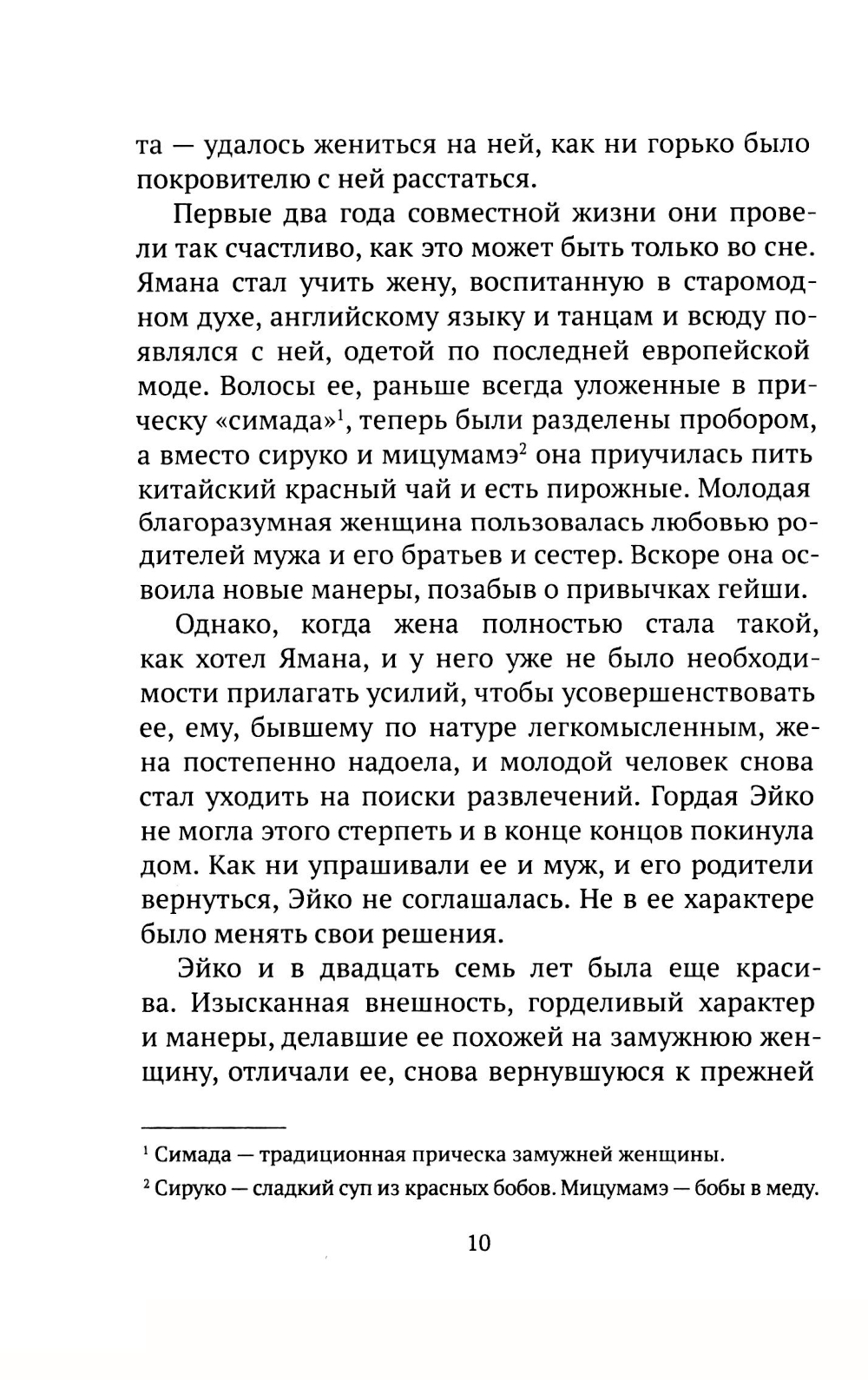 Какими мы представляем себе японских женщин? Роскошный цветок, распустившийся на татами или на футоне, изысканное, нежное существо, созданное для того лишь, чтобы приносить радость мужчинам, служить им и радовать глаз. Судя по древним текстам, таким, как «Повесть о Гэндзи» или «Дневник Идзуми Сикибу», таковыми они и были в эпоху Хэйан. Но в начале ХХ века все изменилось. Оказывается, у этих цветов хранились спрятанные до поры до времени острые шипы. Японский писатель Танидзаки Сэйдзи в своем романе «Гейша Эйко» пишет о сильной, страстной женщине, не признающей ни малейших компромиссов в своей любви, и о мужчинах, завязших по уши в быту, запутавшихся в семейных дрязгах, нерешительных и малодушных. Танидзаки Сэйдзи (1890-1971) - младший брат знаменитого Танидзаки Дзюнъитиро. Начал заниматься литературной деятельностью под влиянием своего знаменитого брата и, как литератор, достиг больших успехов. Он написал более сорока повестей и рассказов, кроме того, прославился и как знаток английской литературы, и как прекрасный переводчик.| Издательство | Гиперион |