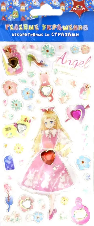 В наборе: объемные гелевые наклейки (фигурка девочки, цветочки, сердечки, бабочки, и другие элементы, а также акриловые стразы в форме сердечка).