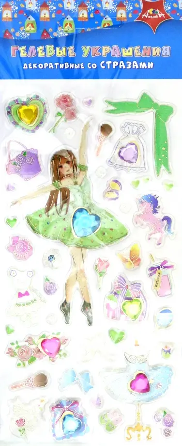 В наборе: объемные гелевые наклейки (фигурка девочки, цветочки, сердечки, бабочки, и другие элементы, а также акриловые стразы в форме сердечка).