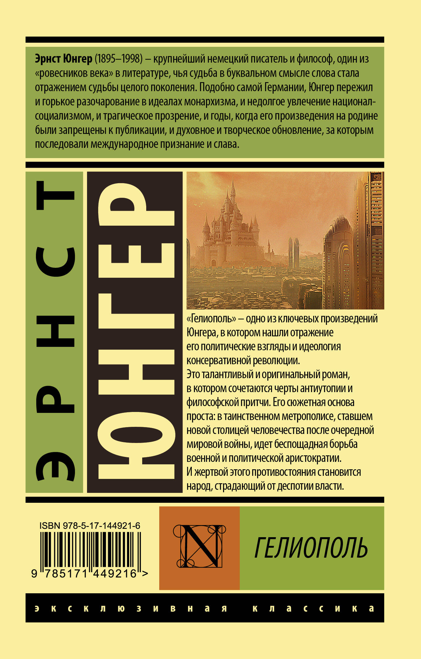 "Гелиополь" - одно из ключевых произведений Юнгера, в котором нашли отражение его политические взгляды и идеология консервативной революции. Это талантливый и оригинальный роман, в котором сочетаются черты антиутопии и философской притчи. Его сюжетная основа проста: в таинственном метрополисе, ставшем новой столицей человечества после очередной мировой войны, идет беспощадная борьба военной и политической аристократии. И жертвой этого противостояния становится народ, страдающий от деспотии власти.