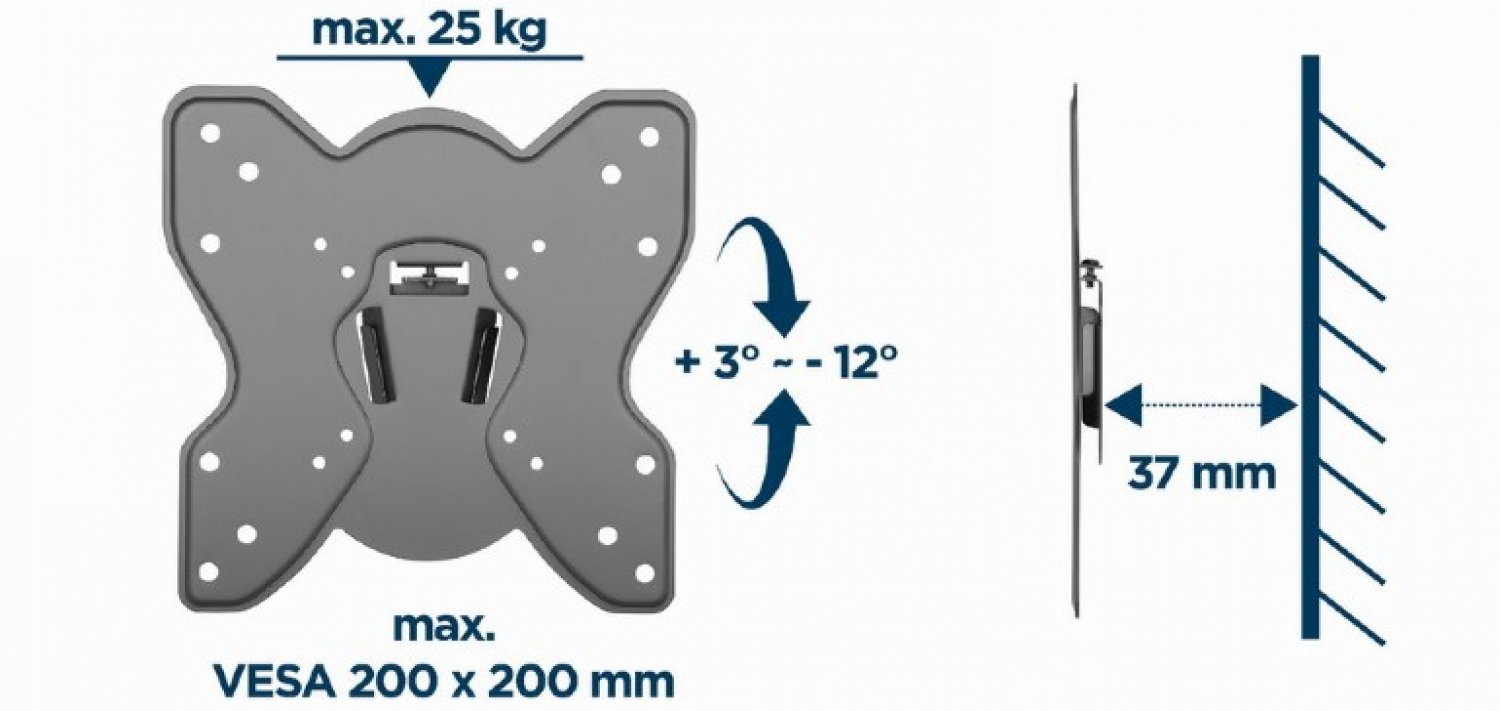 <p>Минимальный размер экрана: 23 дюйма.<br>Максимальный размер экрана: 42 дюйма.<br>Минимальный размер VESA (мм): 75x75.<br>Максимальный размер VESA (мм): 200x200<br>Максимальный вес: 25 кг</p>
