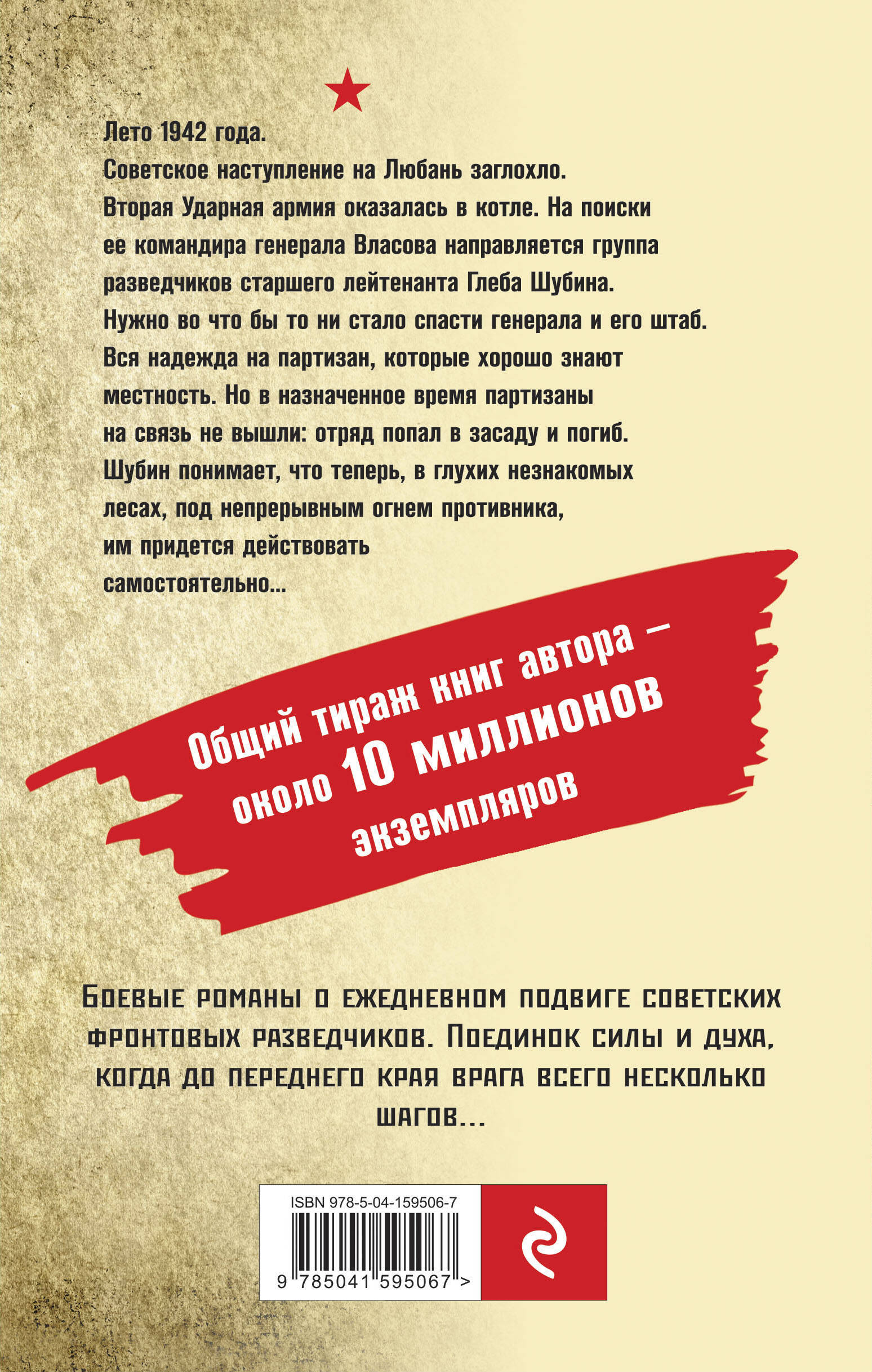Боевые романы о ежедневном подвиге советских фронтовых разведчиков. Поединок силы и духа, когда до переднего края врага всего несколько шагов. Подробности жестоких боев, о которых не рассказывают даже ветераны-участники тех событий. Лето 1942 года. Советское наступление на Любань заглохло. Вторая Ударная армия оказалась в котле. На поиски ее командира генерала Власова направляется группа разведчиков старшего лейтенанта Глеба Шубина. Нужно во что бы то ни стало спасти генерала и его штаб. Вся надежда на партизан, которые хорошо знают местность. Но в назначенное время партизаны на связь не вышли: отряд попал в засаду и погиб. Шубин понимает, что теперь, в глухих незнакомых лесах, под непрерывным огнем противника, им придется действовать самостоятельно… Общий тираж книг автора - более 10 миллионов экземпляров.| Издательство | ООО "Издательство "Эксмо" |