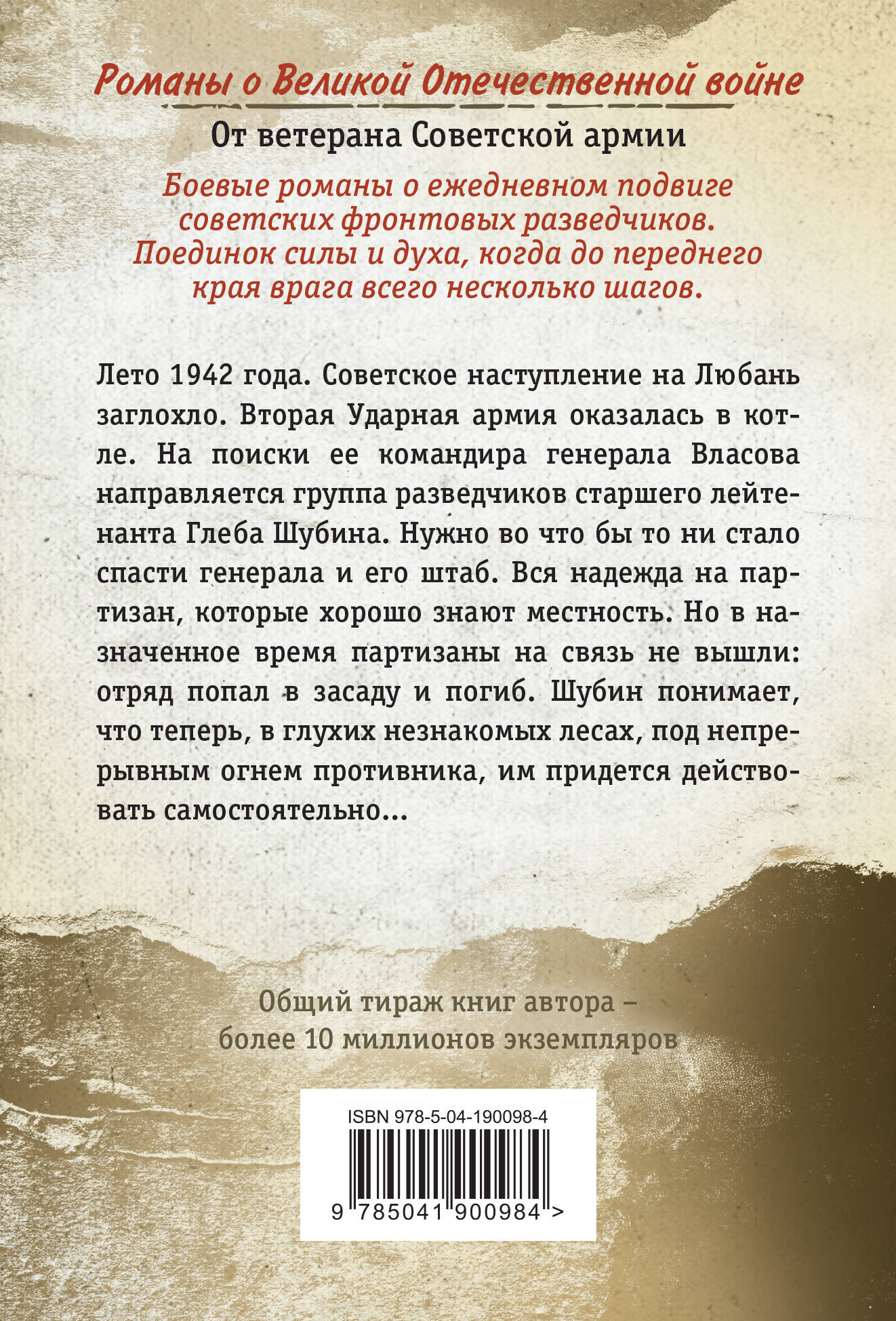 Боевые романы о ежедневном подвиге советских фронтовых разведчиков. Поединок силы и духа, когда до переднего края врага всего несколько шагов. Подробности жестоких боев, о которых не рассказывают даже ветераны - участники тех событий. Лето 1942 года. Советское наступление на Любань заглохло. Вторая Ударная армия оказалась в котле. На поиски ее командира генерала Власова направляется группа разведчиков старшего лейтенанта Глеба Шубина. Нужно во что бы то ни стало спасти генерала и его штаб. Вся надежда на партизан, которые хорошо знают местность. Но в назначенное время партизаны на связь не вышли: отряд попал в засаду и погиб. Шубин понимает, что теперь, в глухих незнакомых лесах, под непрерывным огнем противника, им придется действовать самостоятельно… Общий тираж книг автора - более 10 миллионов экземпляров.| Издательство | ООО "Издательство "Эксмо" |