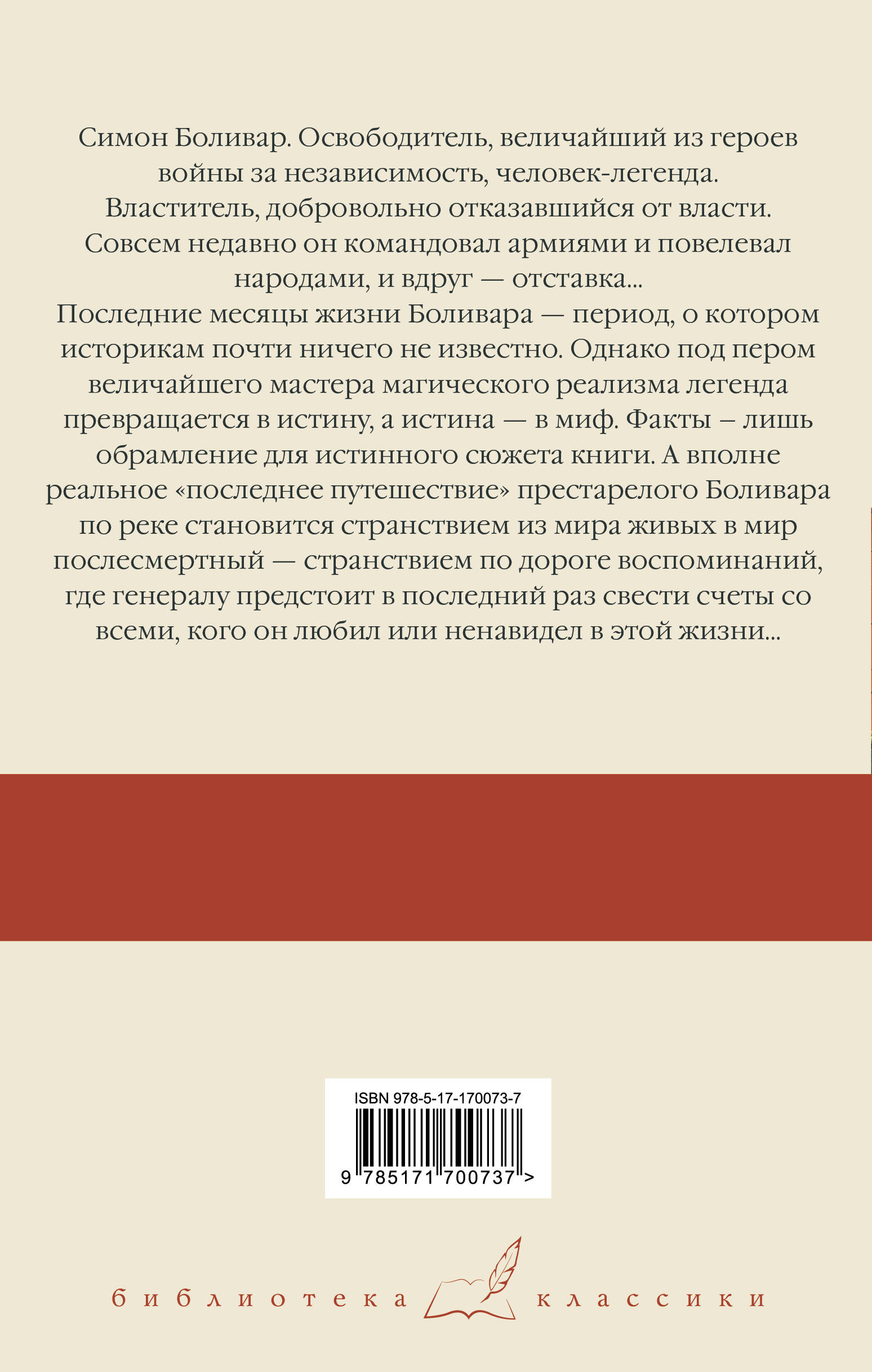 Лауреат Нобелевской премии по литературе, автор бестселлеров «Сто лет одиночества» и «Любовь во время чумы» Габриэль Гарсиа Маркес несколько лет хотел написать книгу, действие которой разворачивалось бы в окрестностях реки Магдалена - местности, в которой прошло детство писателя. Однажды он прочел «Последнее путешествие» - незаконченную рукопись своего друга, писателя Альваро Мутиса, посвященную последним месяцам жизни Симона Боливара, проведенным Великим Освободителем как раз возле реки Магдалена. Поскольку Мутис не собирался заканчивать рукопись, Маркес попросил у него разрешения позаимствовать идею книги. Приступив к работе над романом, Маркес два года потратил на сбор материала и изучение исторических документов, в том числе писем Боливара, газетных вырезок того времени и семнадцати томов мемуаров Даниэля Флоренсио О'Лири - адъютанта Великого Освободителя.| Издательство | Издательство "АСТ" |