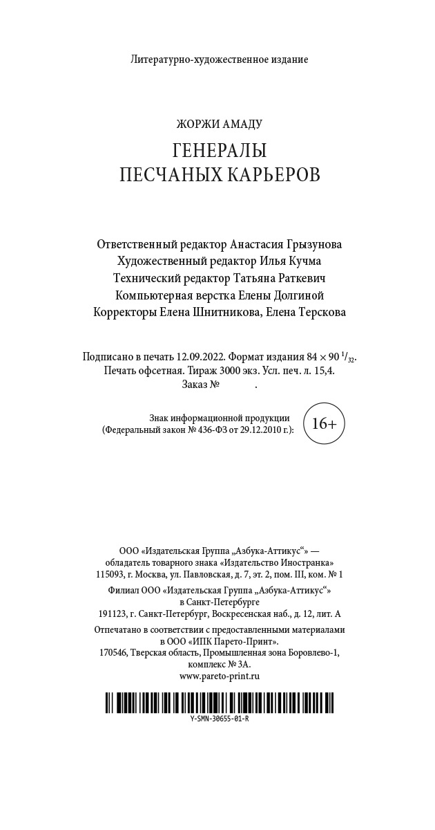 Жоржи Амаду - непревзойденный певец солнечной Бразилии, некогда скандальный автор, а ныне признанный классик, чьи книги переведены на полсотни языков, издаются в десятках стран и стали основой для множества фильмов и сериалов. Он родился в Баии, бразильском штате на побережье Атлантического океана, и там происходит действие самых известных его романов - в том числе последнего романа «баиянского цикла» «Генералы песчаных карьеров». В Бразилии «Генералы», ради которых писатель объехал обе Америки, - одна из самых любимых его книг, в остальном мире - одна из самых известных (в 1971 году Холл Бартлет экранизировал ее, и фильм стал культовым). Банда «генералов песчаных карьеров» - беспризорников, ночующих на песчаных пляжах Баии, - совершает дерзкие ограбления, скрывается от полиции, страдает и веселится, плачет и хохочет, молится, мечтает и свято чтит неписаные законы дружбы. В Бразилии Жоржи Амаду перемешаны все мыслимые краски, все образы жизни и все возможные судьбы; здесь круглые сутки звучит музыка, нищета непрерывно воюет с богатством, благочестие уживается под одной крышей с самыми ужасными пороками, слезы перемежаются смехом, а жестокая реальность запросто соседствует с повседневной магией.| Издательство | Иностранка |