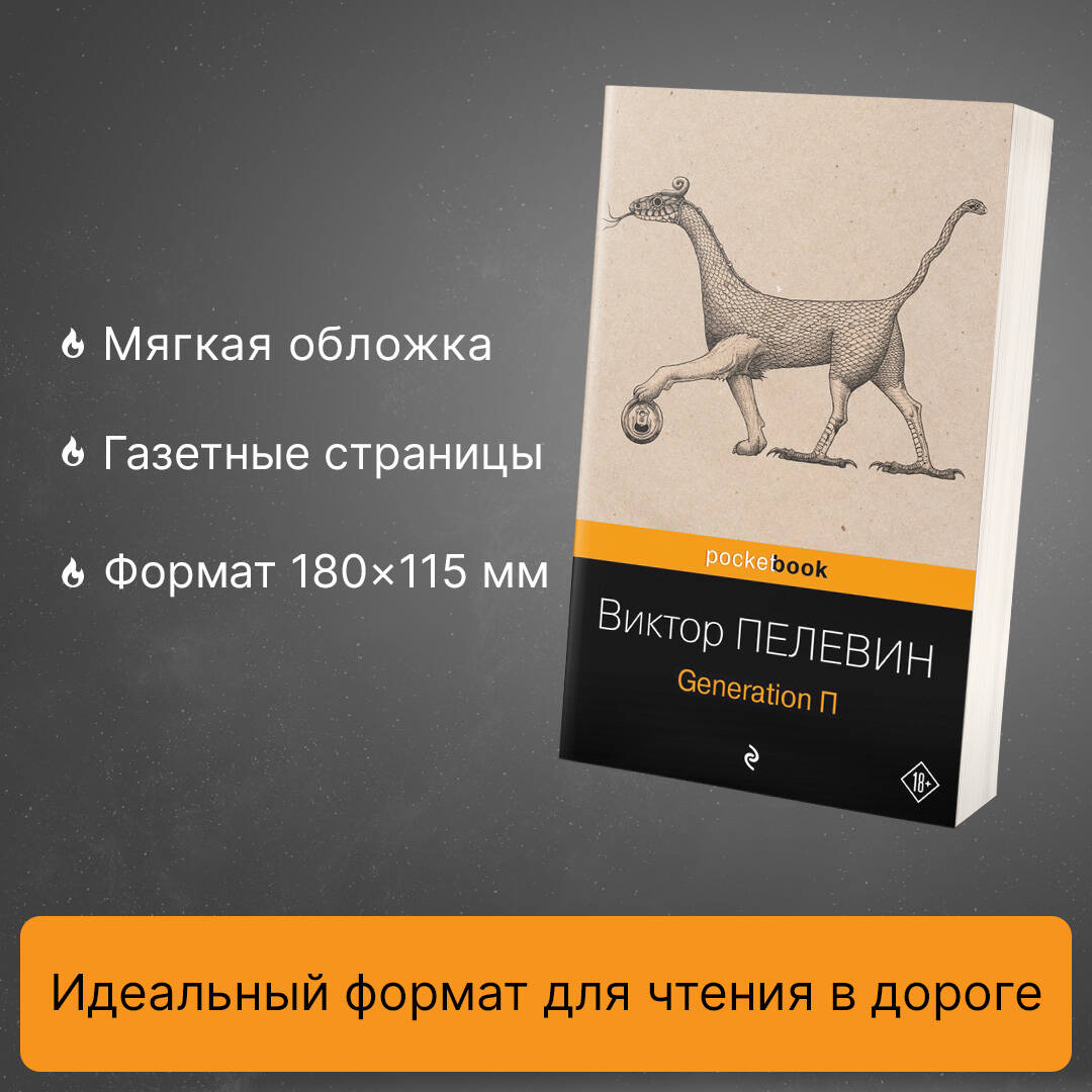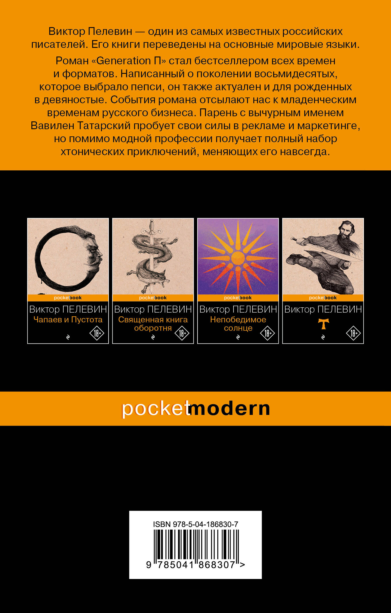 Роман «Generation П» стал бестселлером всех времен и форматов. Написанный о поколении семидесятых, которое выбрало пепси, он странным образом читается свежо и для поколения, рожденного в девяностые. Происходящее в романе отсылает нас к заре русского бизнеса. Молодой парень с вычурным именем Вавилен Татарский пробует свои силы в рекламе и маркетинге, но помимо модной профессии получает полный набор хтонических приключений, меняющих его навсегда.| Издательство | ООО "Издательство "Эксмо" |