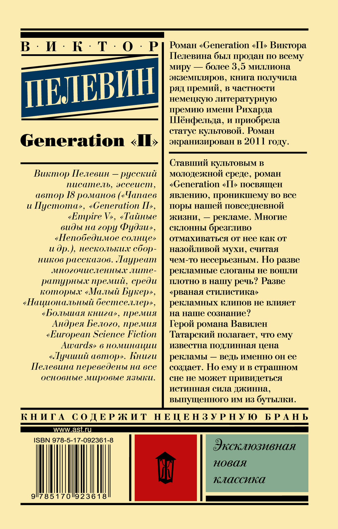Виктор Пелевин - российский писатель, лауреат многочисленных литературных премий. Книги Пелевина переведены на все главные мировые языки, включая китайский и японский. Пьесы по его рассказам с успехом идут в театрах Москвы, Парижа и Лондона. С 1989 года работал штатным корреспондентом журнала «Face to face» в течение года. С того же времени сотрудничал с различными газетами и журналами, выходящими в Москве. French Magazine включил Виктора Пелевина в список 1000 самых значимых современных деятелей мировой культуры.| Издательство | ИЗДАТЕЛЬСТВО "АСТ" |