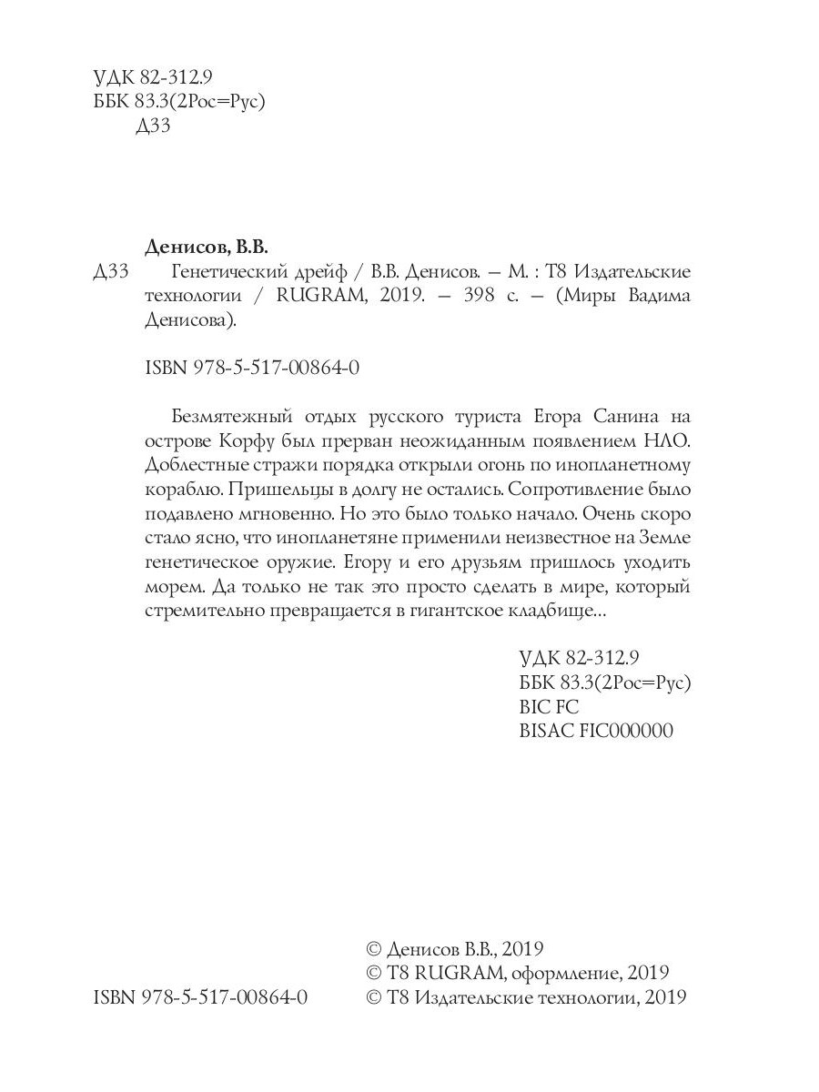 Безмятежный отдых русского туриста Егора Санина на острове Корфу был прерван неожиданным появлением НЛО. Доблестные стражи порядка открыли огонь по инопланетному кораблю. Пришельцы в долгу не остались. Сопротивление было подавлено мгновенно. Но это было только начало. Очень скоро стало ясно, что инопланетяне применили неизвестное на Земле генетическое оружие. Егору и его друзьям пришлось уходить морем. Да только не так это просто сделать в мире, который стремительно превращается в гигантское кладбище...| Издательство | Т8 RUGRAM |
