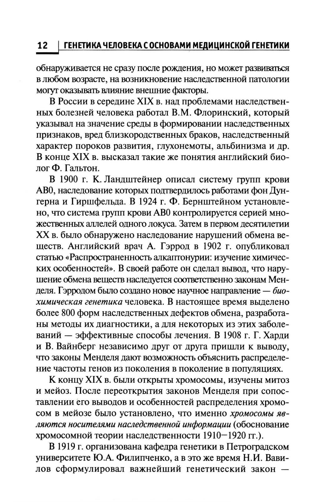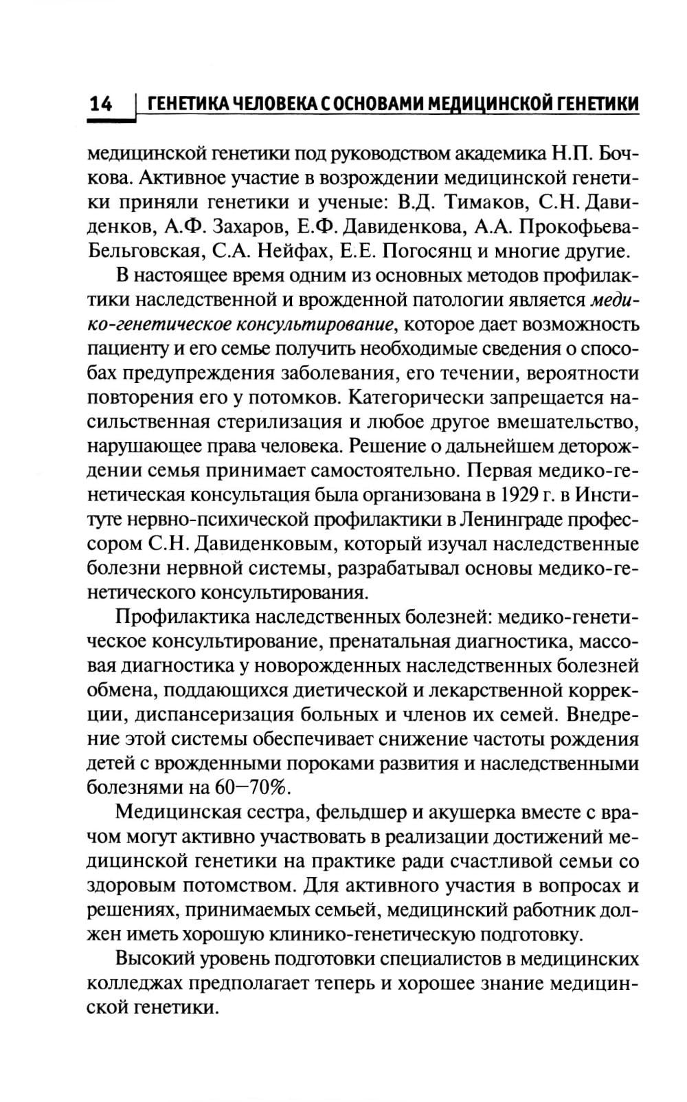В учебнике представлена современная информация по основным разделам генетики человека с основами медицинской генетики, включая историю и методы изучения генетики, биохимические и цитологические основы наследственности, закономерности наследования признаков и виды взаимодействия генов, методы изучения наследственности и изменчивости в норме и патологии, основные виды изменчивости, виды мутаций у человека. Отражены причины и механизмы основных групп наследственных заболеваний и современные рекомендации по организации программ профилактики и лечения наследственных болезней, а также подходы к реабилитации больных. Учебник подготовлен в соответствии с Федеральным Государственным образовательным стандартом 3-го поколения среднего профессионального образования по специальности «Лечебное дело», «Акушерское дело» и «Сестринское дело» и предназначен для студентов медицинских колледжей и училищ, в помощь преподавателям медицинской генетики, а также для широкого круга читателей, интересующихся основными положениями генетики человека.| Издательство | Феникс |