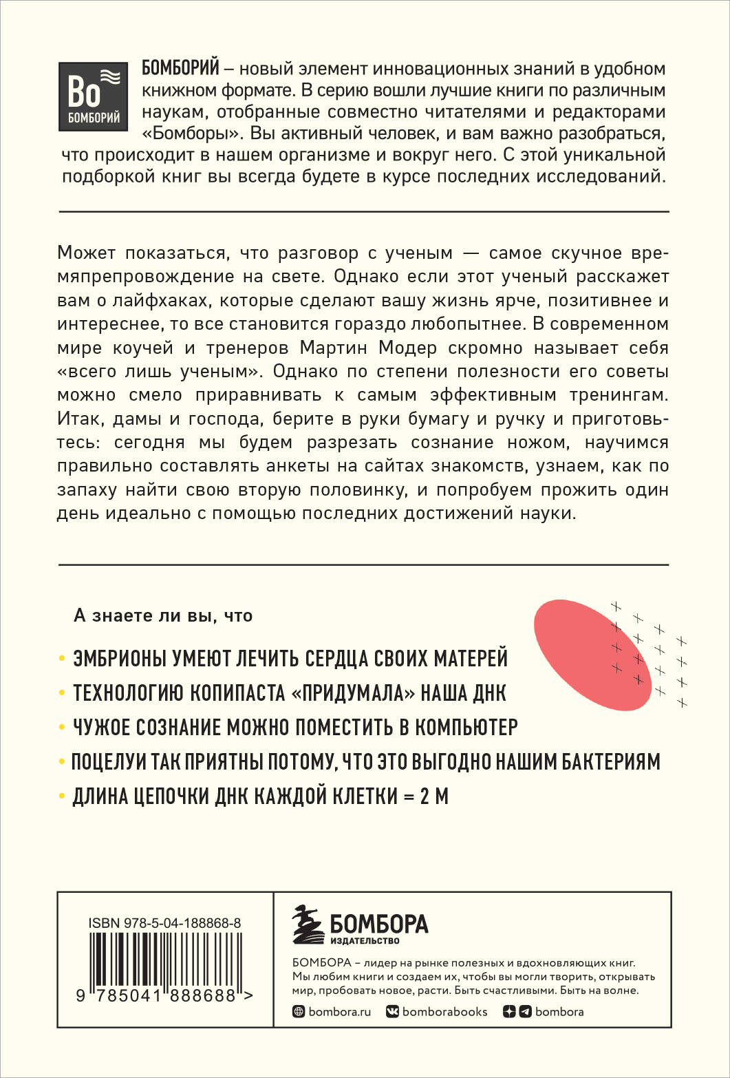 «Я хочу стать ученым», - говорит ребенок, наверняка думая о том, как будет создавать вещи из воздуха, искать в своей лаборатории радиоактивных пауков или изобретать стрельбу лазерными лучами. А вот автор этой книги понял, что займется наукой, когда в детстве изучал мясорубку и засунул в нее палец: ему стало очень интересно, как работает человеческое тело и - особенно - как остановить кровь. С помощью этой книги Мартин Модер заражает читателя любовью к науке, экспериментам и фактам. Он привлекает генетику, биологию и медицину к решению повседневных проблем и делится необычными, но действенными лайфхаками. Вы узнаете, сколько съесть хлеба, чтобы получить легкую степень опьянения, как победить простуду при помощи обнимашек и как старые носки могут спасти жизнь.| Издательство | ООО "Издательство "Эксмо" |