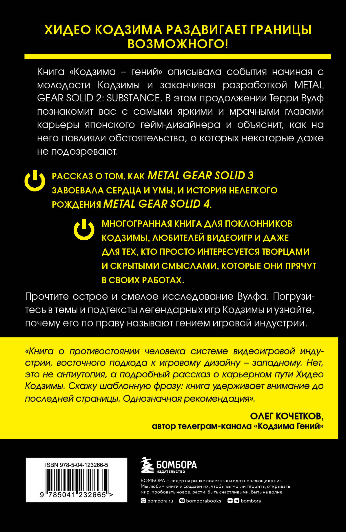 Продолжение книги «Кодзима - гений». Хиодео Кодзима раздвигает границы возможного! Книга «Кодзима - гений» описывала события начиная с молодости Кодзимы и заканчивая разработкой METAL GEAR SOLID 2: SUBSTANCE. В этом продолжении Терри Вулф познакомит вас с самыми яркими и мрачными главами карьеры японского гейм-дизайнера и объяснит, как на него повлияли обстоятельства, о которых некоторые даже не подозревают. • Рассказ о том, как METAL GEAR SOLID 3 завоевала сердца и умы, и история нелегкого рождения METAL GEAR SOLID 4. • Многогранная книга для поклонников Кодзимы, любителей видеоигр и даже для тех, кто просто интересуется творцами и скрытыми смыслами, которые они прячут в своих работах. Прочтите острое и смелое исследование Вулфа. Погрузитесь в темы и подтексты легендарных игр Кодзимы и узнайте, почему его по праву называют гением игровой индустрии. «Книга о противостоянии человека системе видеоигровой индустрии, восточного подхода к игровому дизайну - западному. Нет, это не антиутопия, а подробный рассказ о карьерном пути Хидео Кодзимы. Скажу шаблонную фразу: книга удерживает внимание до последней страницы. Однозначная рекомендация». - Олег Кочетков, автор телеграм-канала «Кодзима Гений»