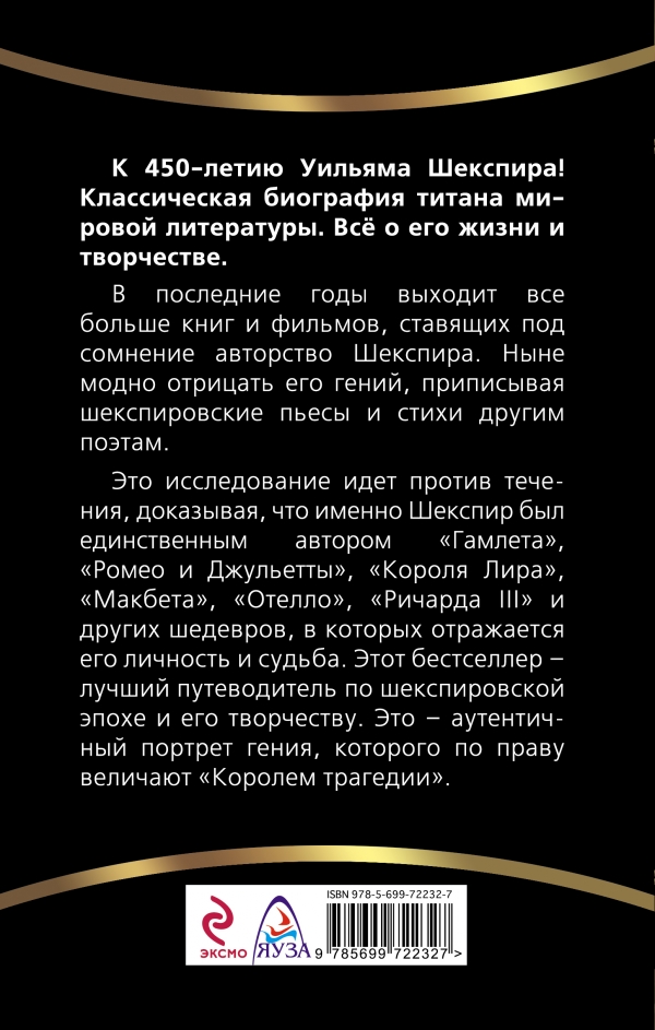 Это исследование идет против течения, доказывая, что именно Шекспир был единственным автором «Гамлета», «Ромео и Джульетты», «Короля Лира», «Макбета», «Отелло», «Ричарда III» и других шедевров, в которых отражается его личность и судьба. Этот бестселлер - лучший путеводитель по шекспировской эпохе и его творчеству. Это - аутентичный портрет гения, которого по праву величают «Королем трагедии».