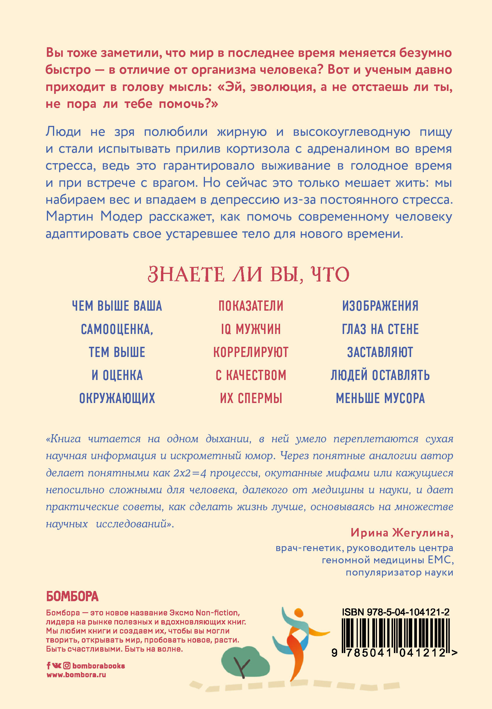 Человеческое тело очень древнее, даже устаревшее с точки зрения эволюции. Новая книга Мартина Модера - о том, как человеку с таким раритетом не просто существовать, но и наслаждаться жизнью в современном мире. А это довольно непросто, ведь в нем изменилось практически всё со времен наших странствий по саванне: и двигаемся мы гораздо меньше, и пища доступнее и калорийнее, и стресс уже не только от физической опасности. В юмористической форме автор рассказывает об удачных и не очень попытках ученых оптимизировать тело человека для нового мира и о том, что каждый человек может сделать для себя сам. Также эта книга расскажет вам: - как одна автомобильная компания смогла понизить уровень IQ у целых регионов; - как обычное мыло для рук может уберечь от ксенофобов; - а также что нужно сделать со своей половинкой, чтобы сложный разговор не закончился плохо.| Издательство | ООО "Издательство "Эксмо" |