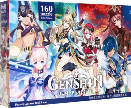Пазлы выполнены в дизайне лицензии «Genshin Impact», имеющей огромную популярность во всем мире. Удобный формат - квадратный пазл из 160 элементов впишется в любой интерьер. Качественные материалы и полиграфия, хорошая сцепка деталей.