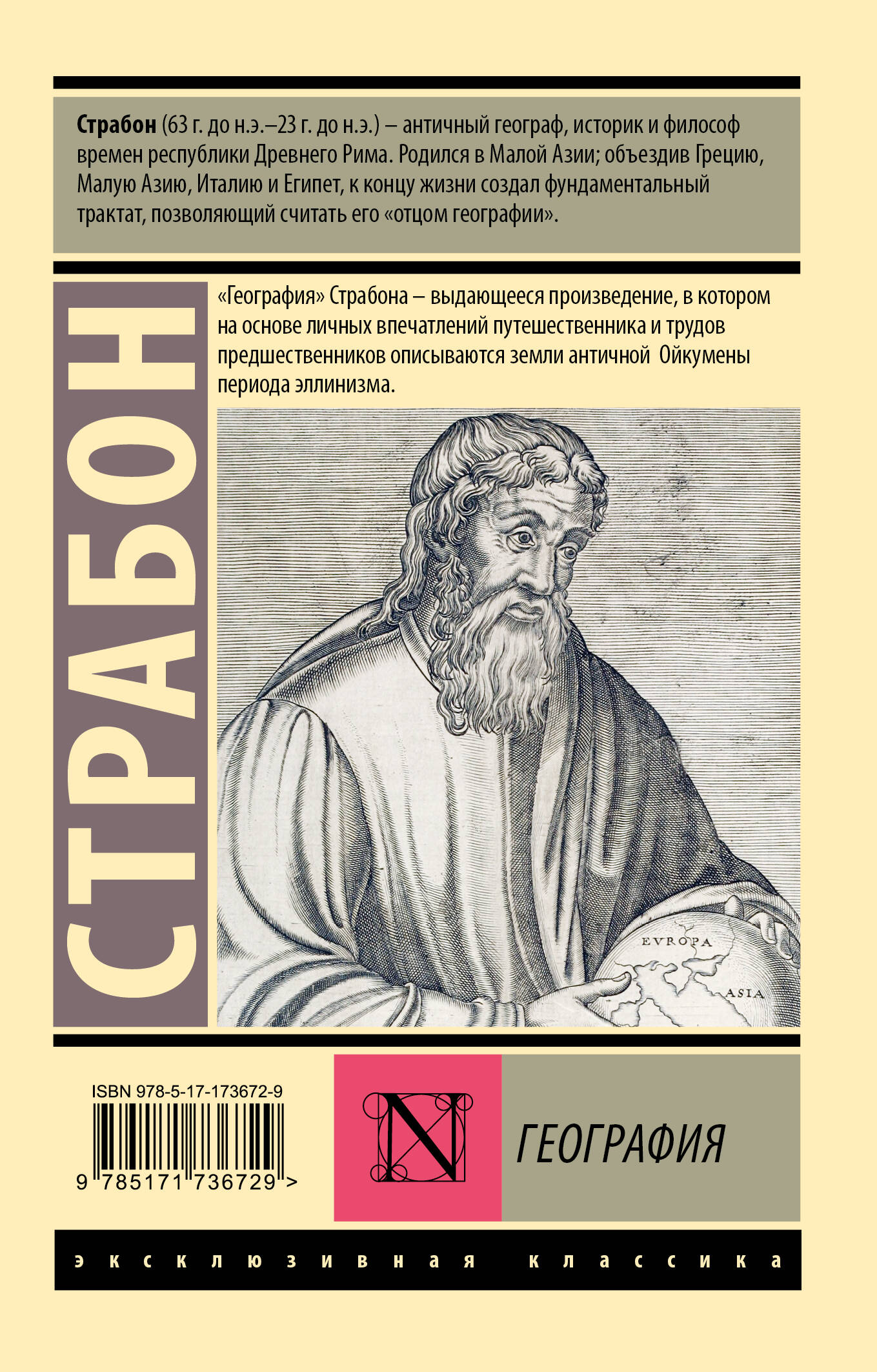 - Страбон - известный античный географ, историк и философ. - «География» - главный труд Страбона, единственный источник информации, позволяющий составить полное представление о состоянии географической науки в античности. - По мнению историков, на создание «Географии» у Страбона ушла большая часть его жизни. - Издание в серии «Эксклюзивная классика» - в удобном карманном формате и узнаваемом оформлении.| Издательство | Издательство "АСТ" |
