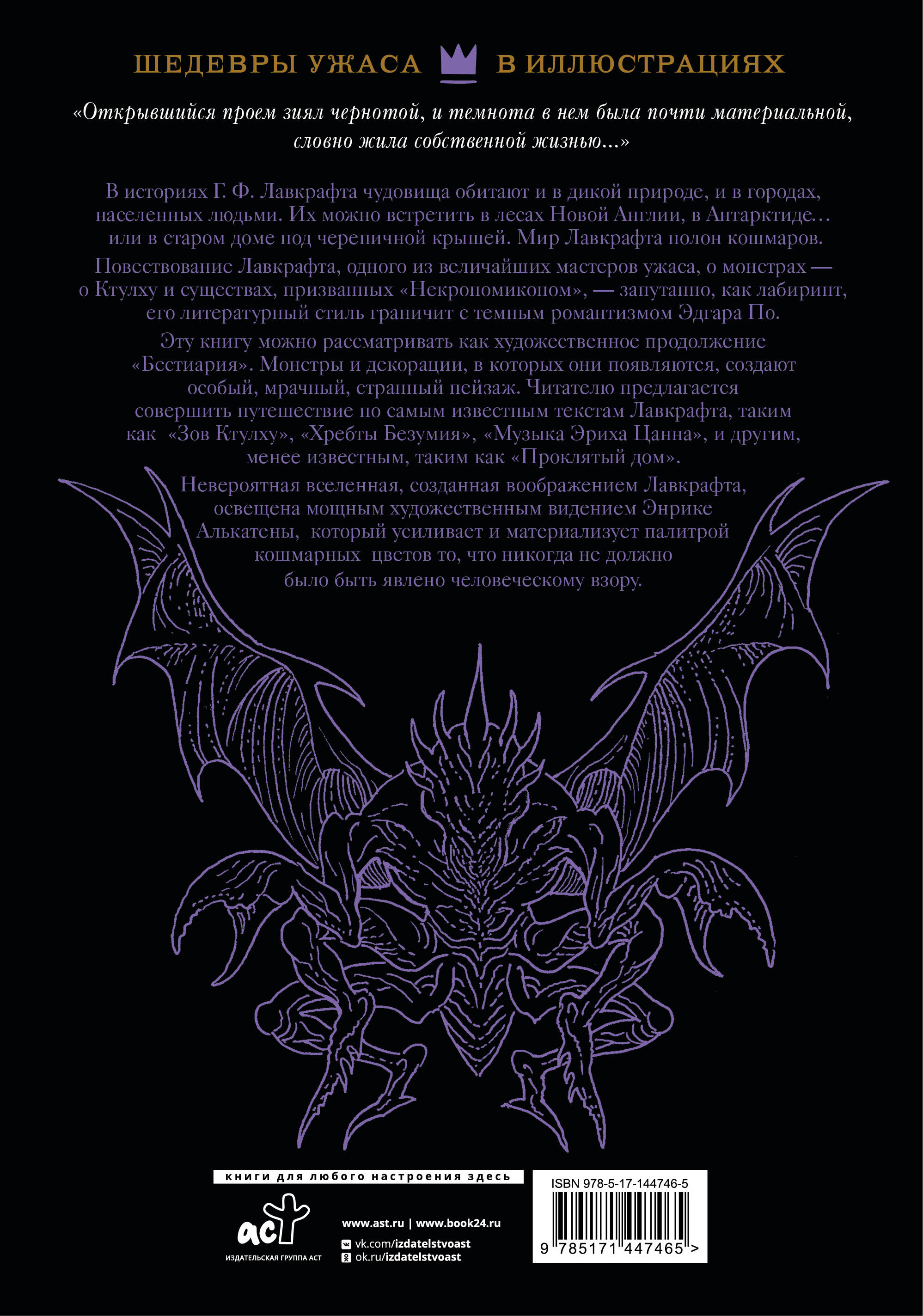 - Продолжение серии иллюстрированных книг по мотивам творчества Говарда Филлипса Лавкрафта. - Иллюстрации выполнил знаменитый аргентинский художник Энрике Алкатена. - В этой книге собраны наиболее яркие пейзажи, созданные фантазией Г.Ф. Лавкрафтом - именно они и воплощены в потрясающих своей детальностью иллюстрациях. - В книгу вошли цитаты и отрывки из произведений Г.Ф. Лавкрафта, а также эксклюзивные комментарии художника. - Подарочное издание на плотной мелованной бумаге - станет отличным подарком для любого поклонника Лавкрафта и мифологии ужасов.| Издательство | ИЗДАТЕЛЬСТВО "АСТ" |