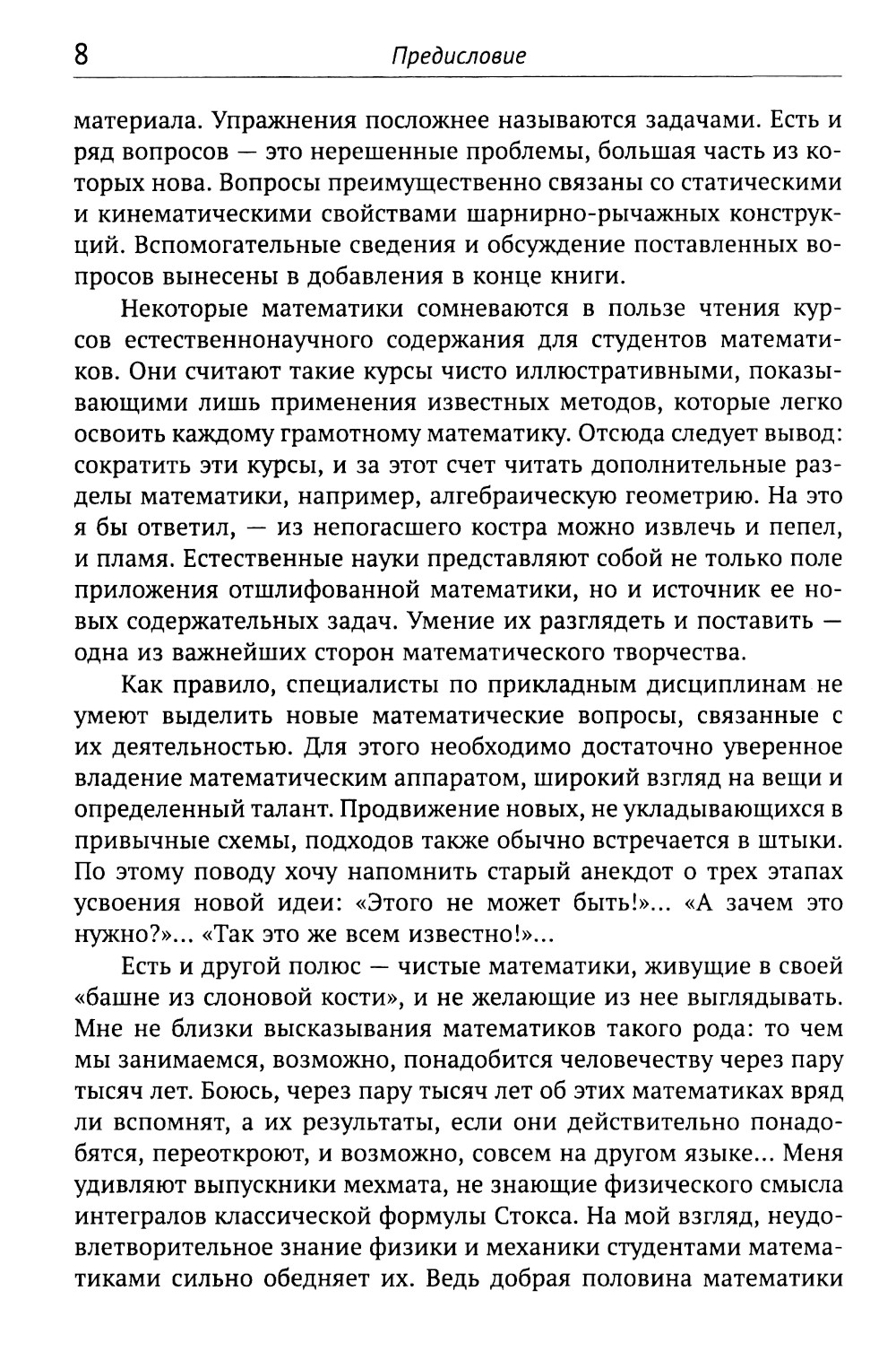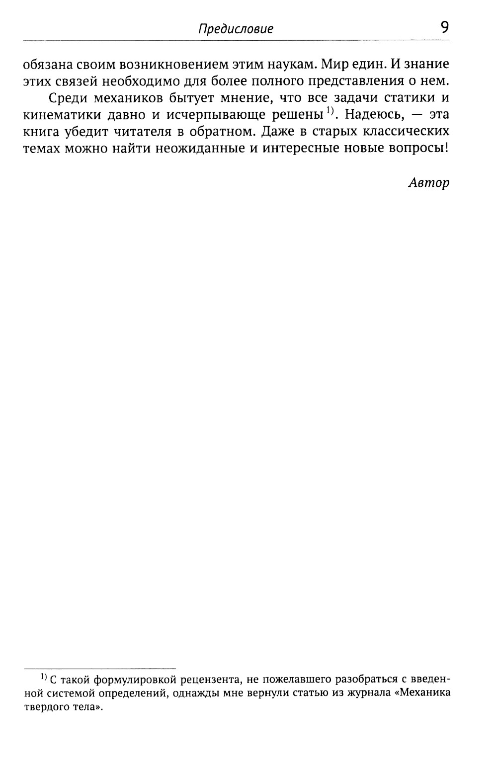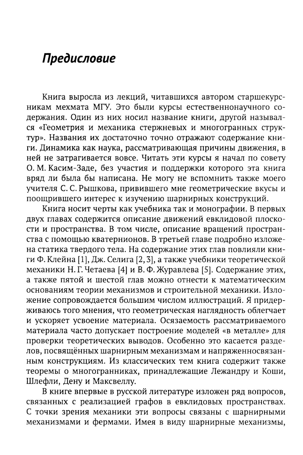 Книга написана на основе лекций на механико-математическом факультете МГУ имени М.В.Ломоносова по курсам естественно-научного содержания. Содержит более тщательное, чем это обычно делается механиками, изложение основ кинематики и статики. Ставит современные геометрические проблемы в этих областях и вплотную подводит к их исследованию. Излагает ряд вопросов, не нашедших отражения в отечественной, а также мировой учебной литературе. Снабжена большим числом иллюстраций, упражнений и задач. Может быть полезна не только студентам-математикам, но и специалистам по геометрии, теоретической механике, теории механизмов, строительной механике, и просто любителям геометрии.