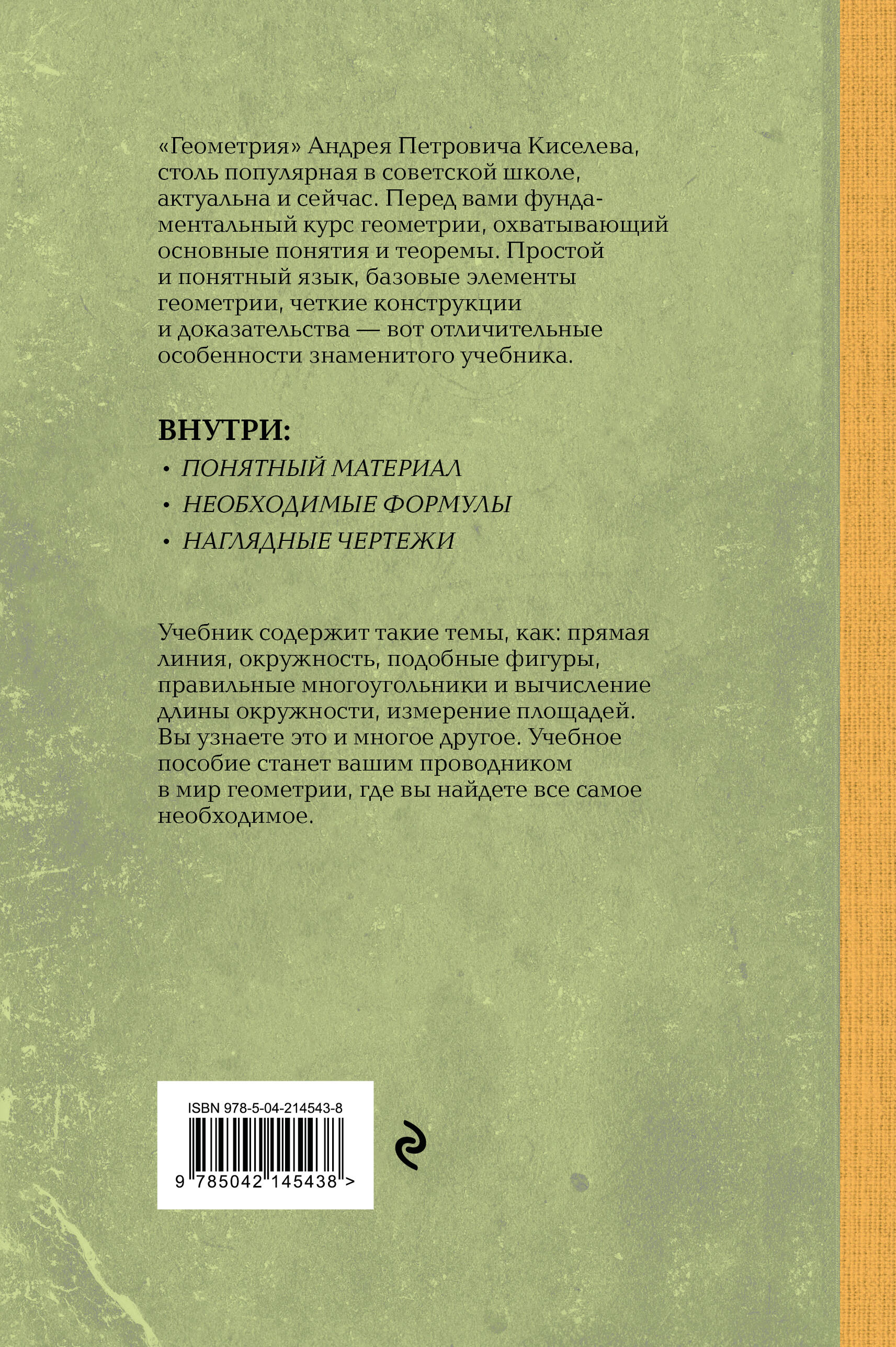 «Геометрия» Андрея Петровича Киселёва, так популярная в советской школе, актуальна и сейчас. Перед вами фундаментальный курс геометрии, охватывающий основные понятия и теоремы. Простой и понятный язык, базовые элементы геометрии, четкие конструкции и доказательства - вот отличительные особенности знаменитого учебника. ВНУТРИ: - ПОНЯТНЫЙ МАТЕРИАЛ. - НЕОБХОДИМЫЕ ФОРМУЛЫ. - НАГЛЯДНЫЕ ЧЕРТЕЖИ. Учебник поможет найти все необходимые знания по геометрии и сформирует базу, необходимую для последующего изучения высшей математики. Сочетание доступности изложения и строгости научного подхода делает его незаменимым пособием для школьников и полезным ресурсом для преподавателей.| Издательство | ООО "Издательство "Эксмо" |