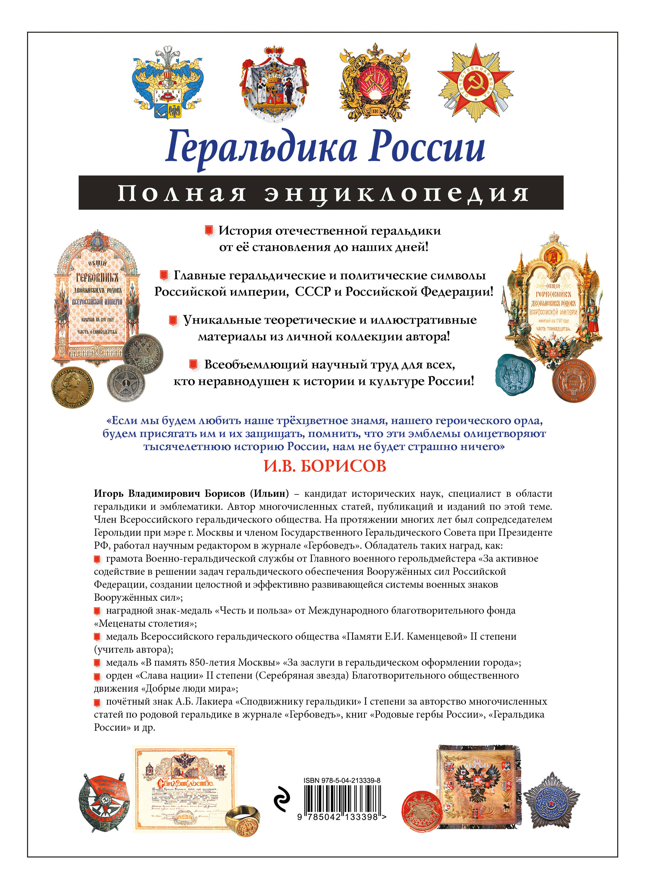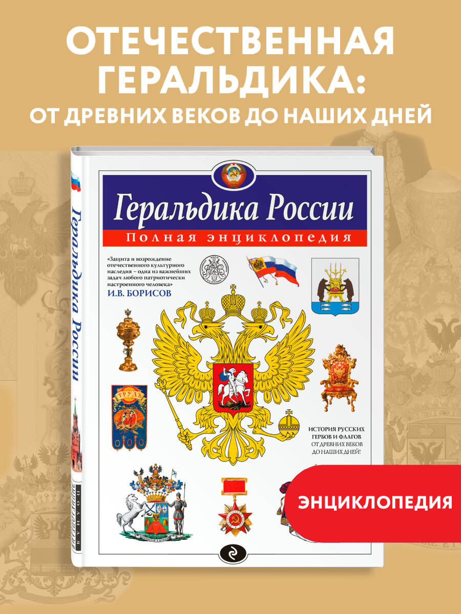 Коллекционная энциклопедия посвящена национальной и государственной отечественной геральдике с момента ее становления до наших дней. Книга подробно и увлекательно рассказывает об эмблематике Российской империи, СССР и Российской Федерации. Отдельно рассматривается геральдика российского дворянства, городская геральдика и гербы на вывесках, промышленных изделиях и т.д. Автор этого уникального труда - кандидат исторических наук, один из ведущих отечественных специалистов в области геральдики и эмблематики И.В. Борисов - на протяжении многих лет состоял в Герольдии при мэре Москвы, а также был членом Государственного Геральдического Совета при Президенте России. В издании использованы уникальные иллюстрации из личного архива автора.| Издательство | ООО "Издательство "Эксмо" |