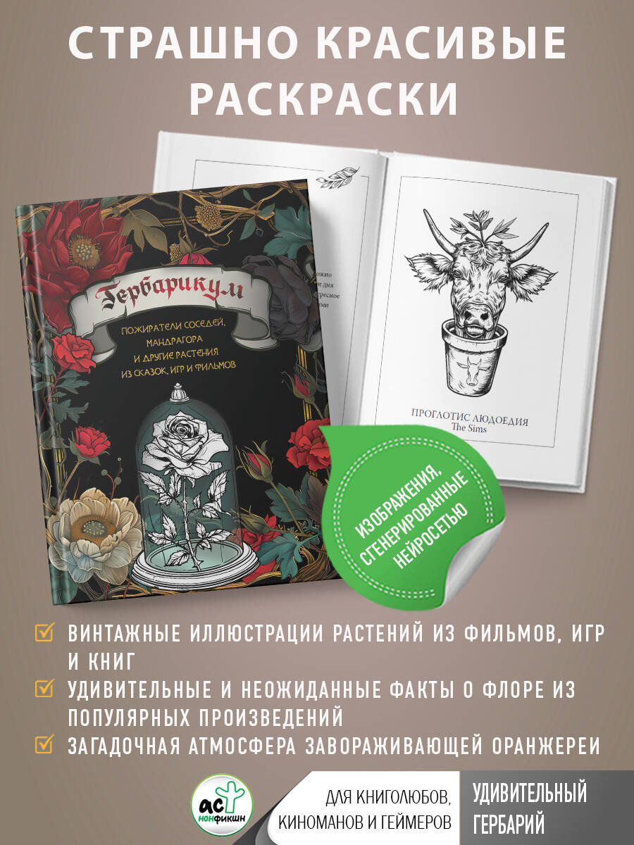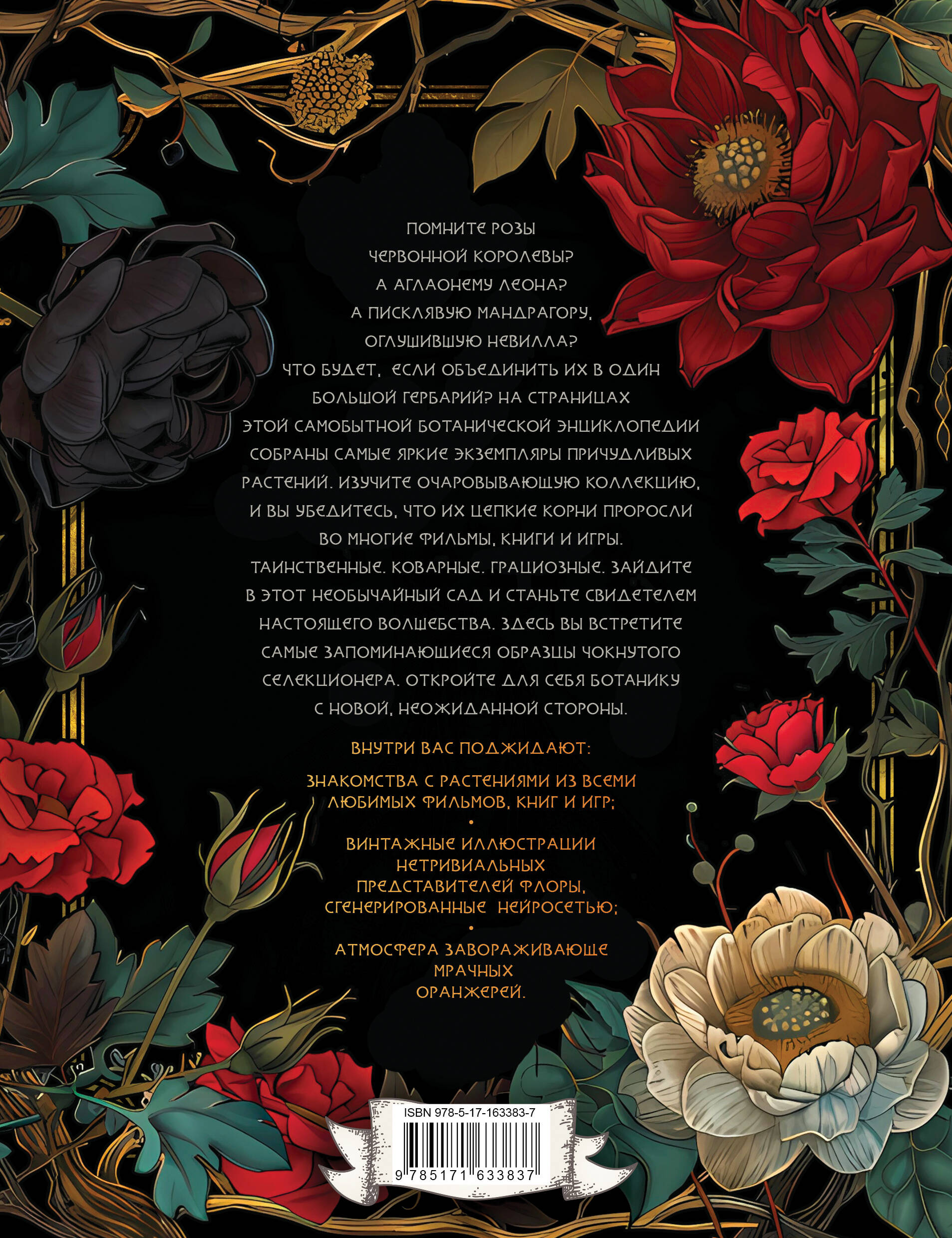 Помните розы Червонной королевы? А аглаонему Леона? А писклявую мандрагору, оглушившую Невилла? Что будет, если объединить их в один большой гербарий? На страницах этой самобытной ботанической энциклопедии собраны самые яркие экземпляры причудливых растений. Изучите очаровывающую коллекцию, и вы убедитесь, что их цепкие корни проросли во многие фильмы, книги и игры. Таинственные. Коварные. Грациозные. Зайдите в этот необычайный сад и станьте свидетелем настоящего волшебства. Здесь вы встретите самые запоминающиеся образцы чокнутого селекционера. Откройте для себя ботанику с новой, неожиданной стороны. Внутри вас поджидают: ● знакомства с растениями из всеми любимых фильмов, книг и игр; ● винтажные иллюстрации нетривиальных представителей флоры, сгенерированные нейросетью; ● атмосфера завораживающе мрачных оранжерей.| Издательство | Издательство "АСТ" |