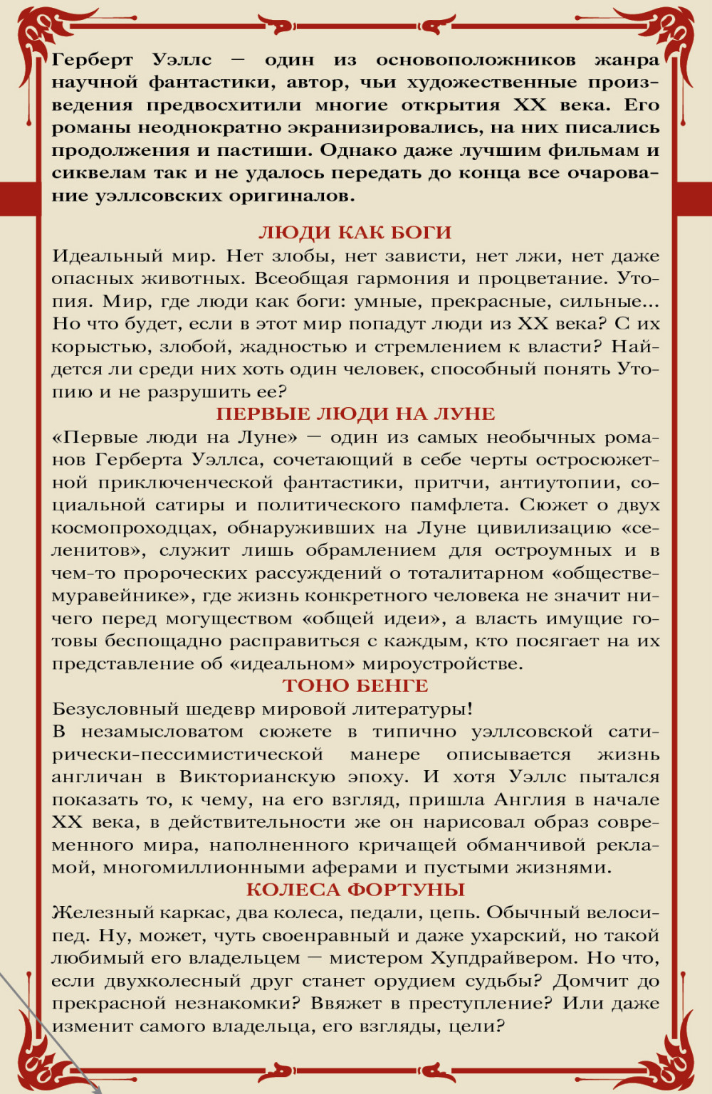 «Первые люди на Луне» - один из самых необычных романов Герберта Уэллса, сочетающий в себе черты остросюжетной приключенческой фантастики, притчи, антиутопии, социальной сатиры и политического памфлета. Сюжет о двух космопроходцах, обнаруживших на Луне цивилизацию «селенитов», служит лишь обрамлением для остроумных и в чем-то пророческих рассуждений о тоталитарном «обществе-муравейнике», где жизнь конкретного человека не значит ничего перед могуществом «общей идеи», а власть имущие готовы беспощадно расправиться с каждым, кто посягает на их представление об «идеальном» мироустройстве.